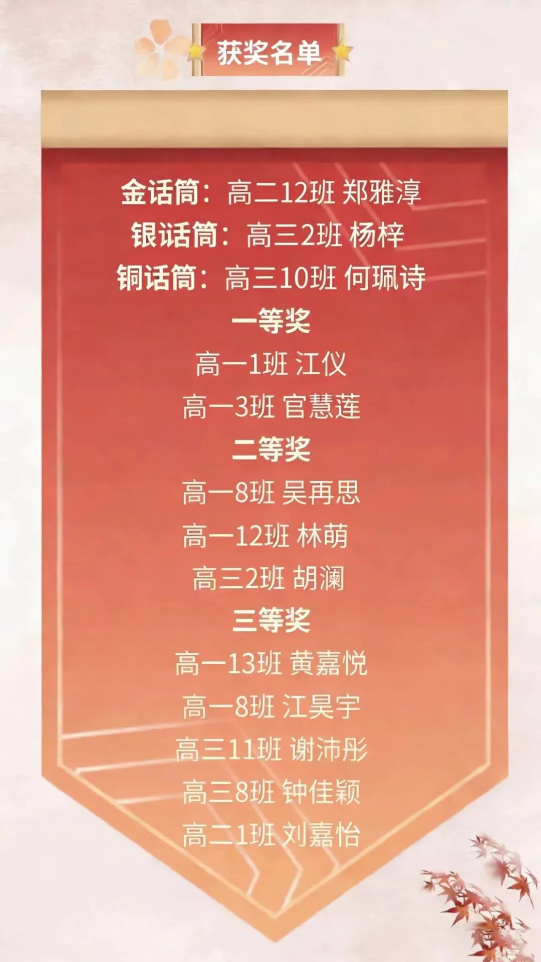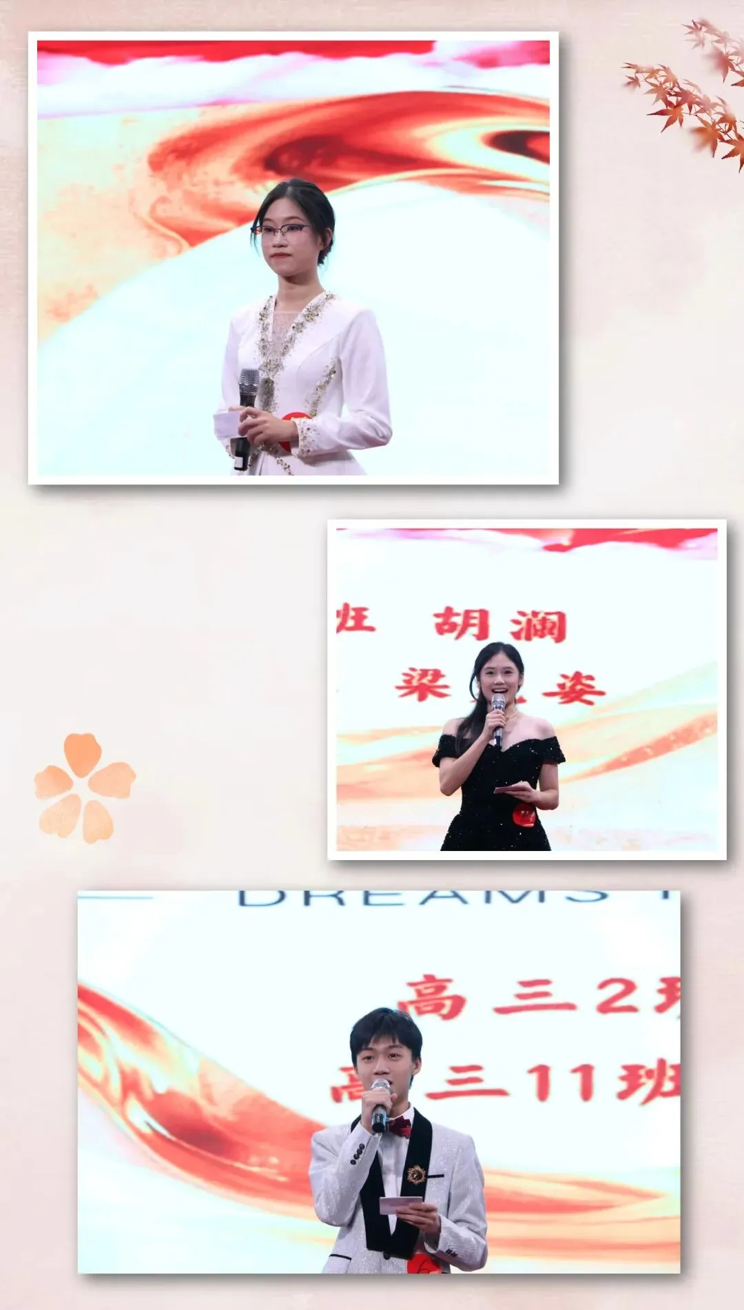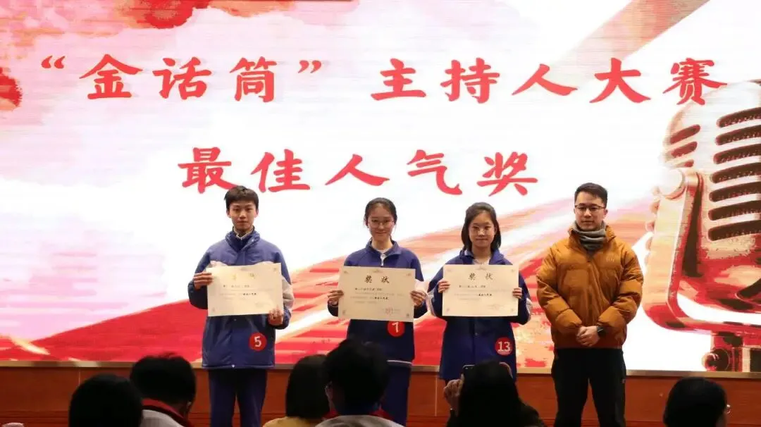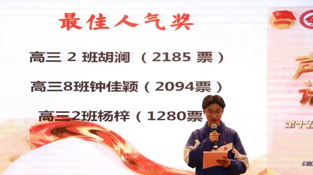 个人展示环节结束后,现场隆重揭晓了“最佳人气奖”的获奖名单:高三2班杨梓、高三8班钟佳颖、高三2班胡澜。高三级张宏杰副级长上台为获奖同学颁奖,全场掌声如潮,为他们送上由衷的祝贺,这既是对获奖者的祝贺,也是对每一位敢于表达、热爱舞台的青年的集体致敬。