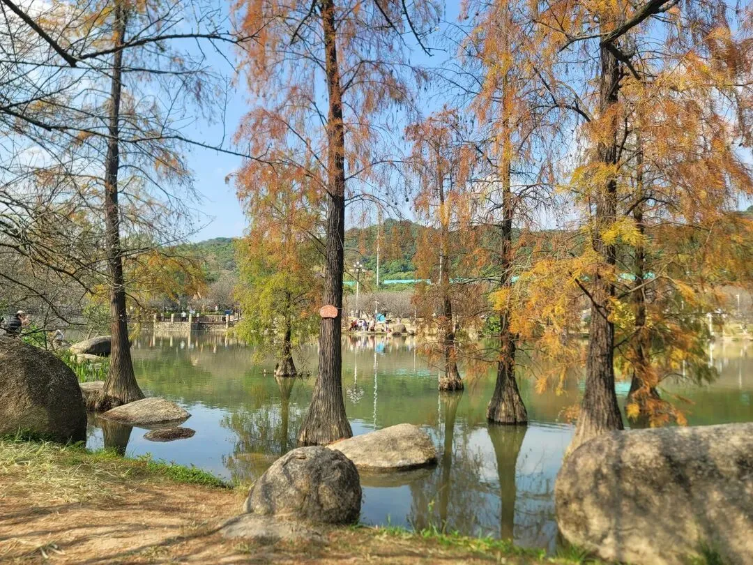 走进公园,首先是一片开阔的湖面,湖水清清亮亮的,湖边有落羽杉、柳树、凉亭、栈道、礁石,给人一种开阔又惬意的感觉