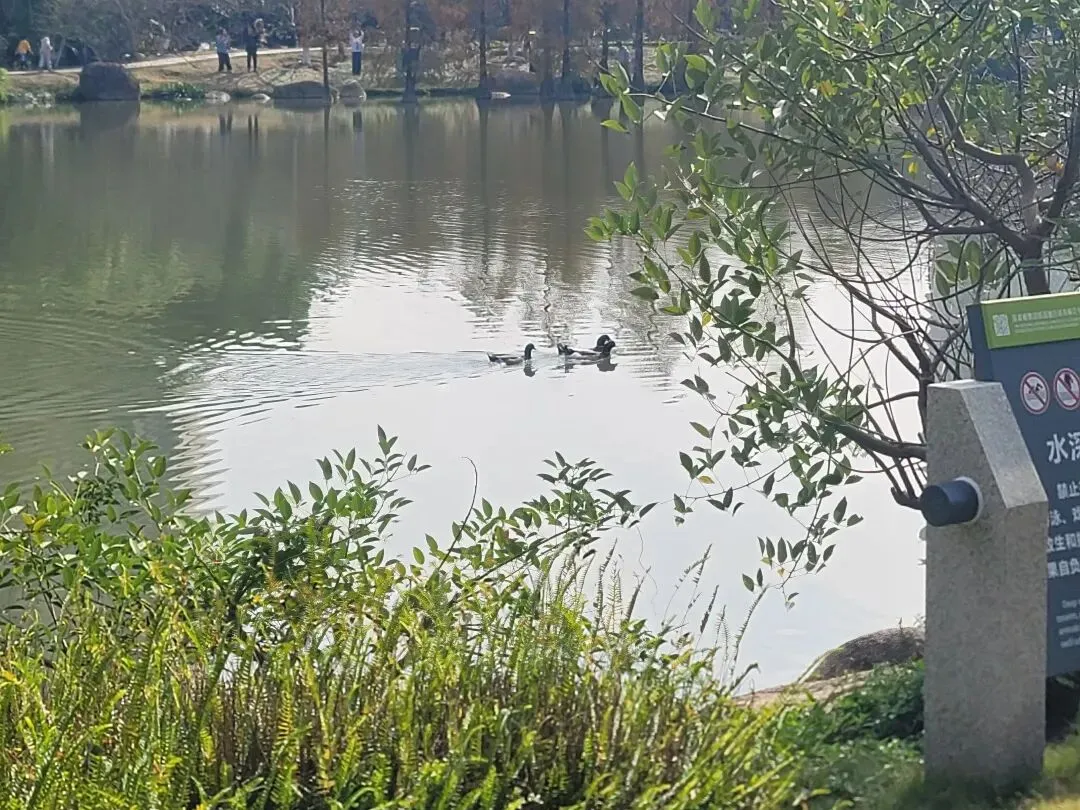 沿着湖边慢慢走,可以看到湖边的落羽杉已经换上了金装,跟湖边仍是翠绿的柳树交相呼应,他们的倒影映在湖水里,美得像一幅幅油画。湖边的小孩在捞鱼、喂鸭、欢笑,一切都是岁月静好的感觉。
