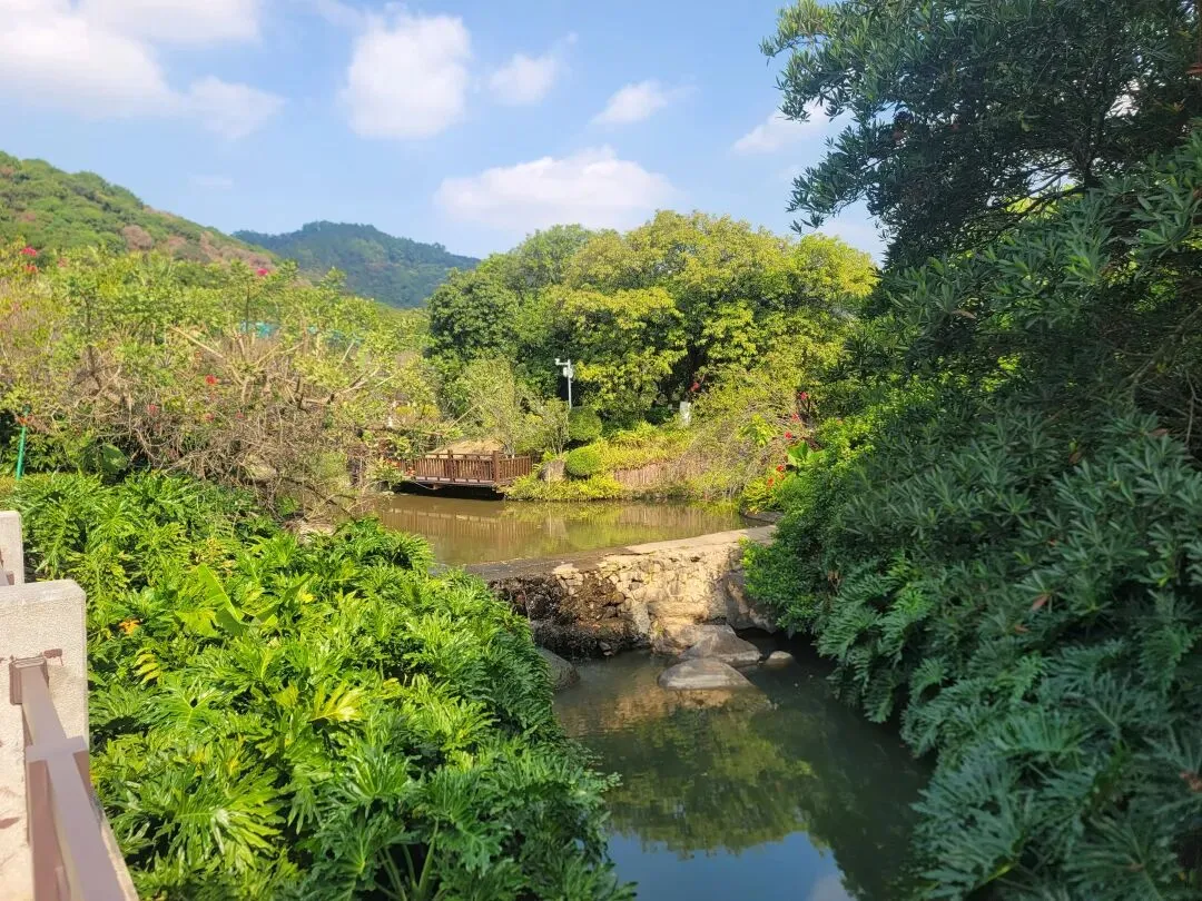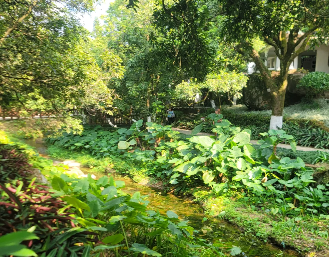穿过梅园,往树林深处走。这里一下子安静下来,小桥流水,青砖灰瓦,阳光透过茂密的枝叶洒在地面上,光影随风而动,听着树上鸟儿格外清晰的叫声,还有山涧潺潺的溪流声,自由且惬意。