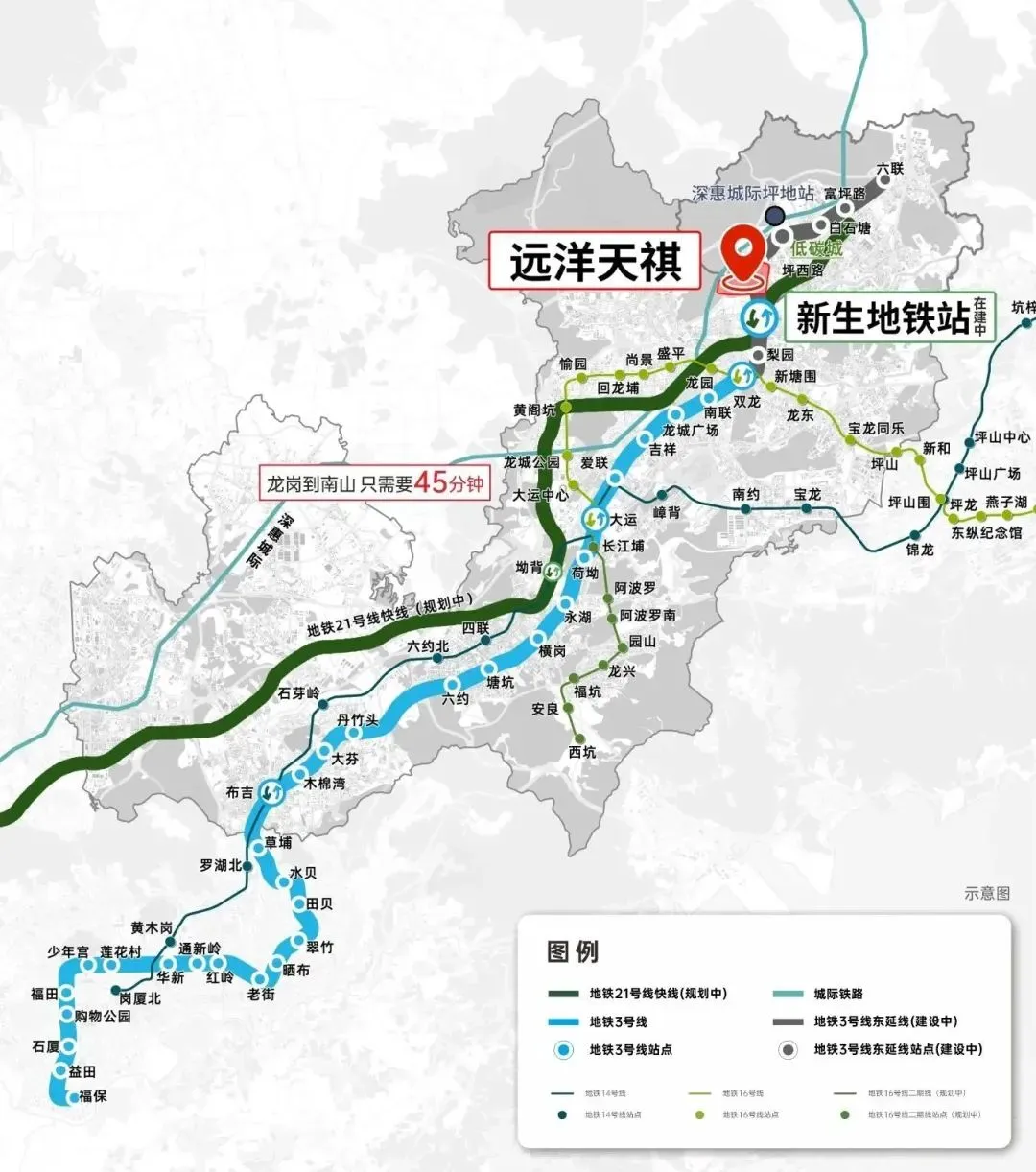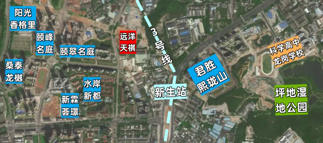 远洋天祺距离地铁3号线东延线和21号快线双轨交汇“新生站”直线距离仅约500米,是片区离地铁最近的在售项目,未来还有深惠城际前海保税区至坪地段,全长58公里,时速160公里/小时,以后从项目到南山、前海也很方便快捷。