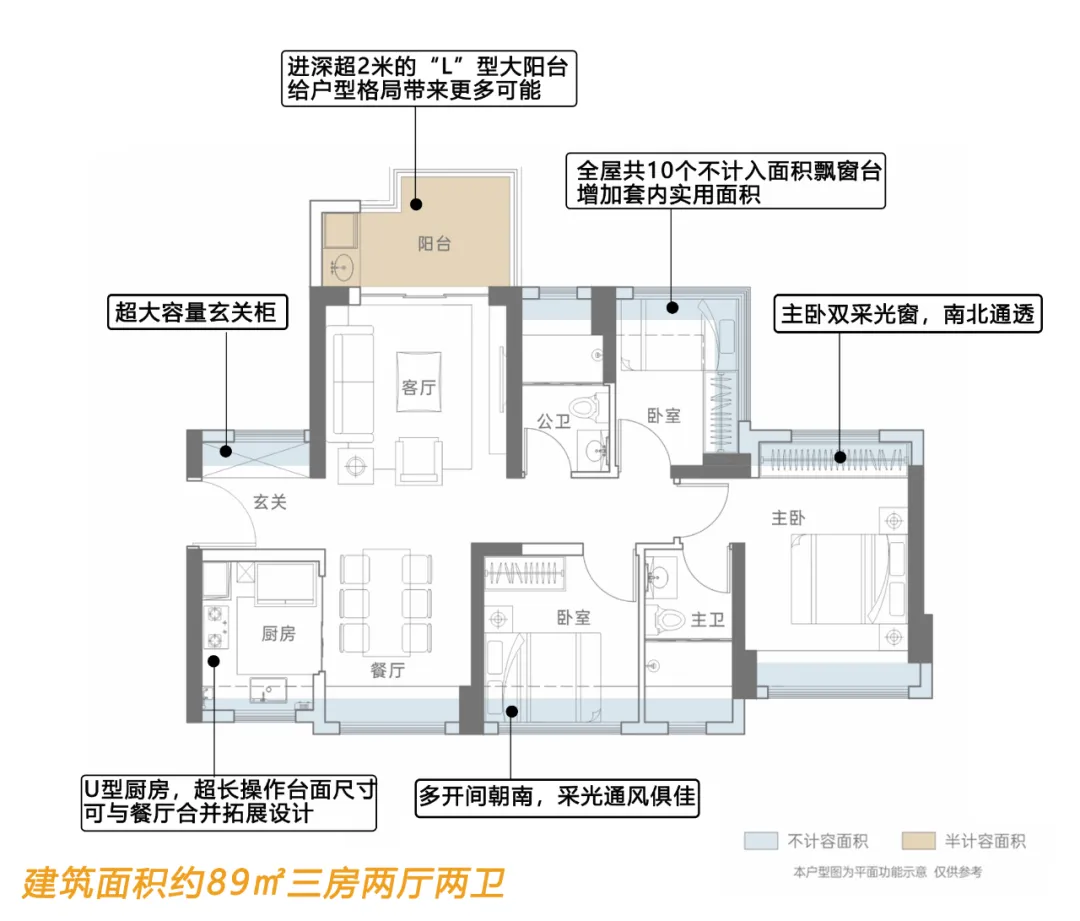 建筑面积约89㎡户型,有10个飘窗;LDKB一体化设计。U型厨房,动线短且方便,还贴心预留双开门冰箱位;主卧套房设计,并且实现了南北通透,次卧与公卫也可以组成类套房,三代人同住也能保证各自的独立空间。