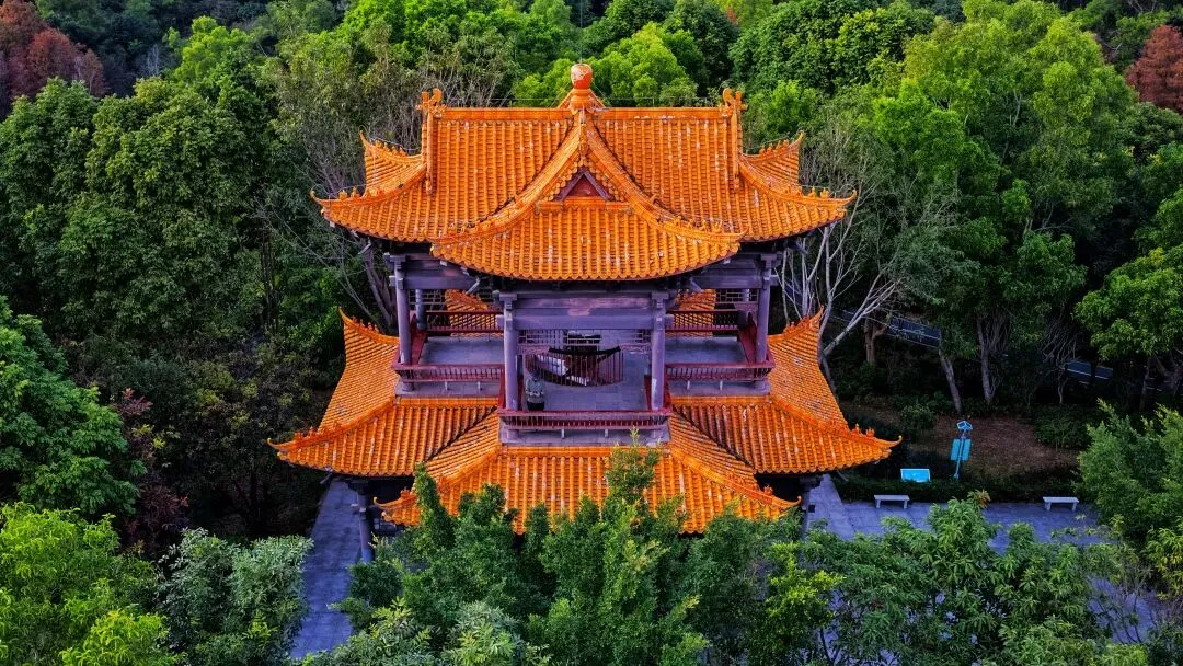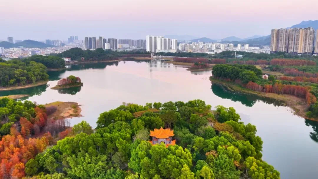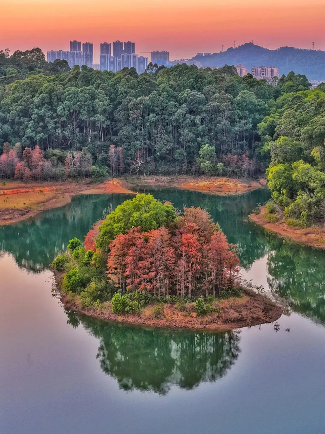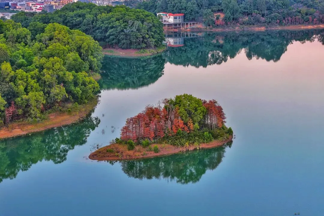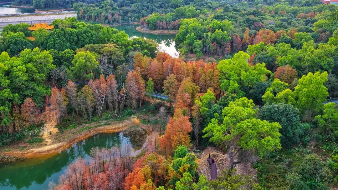 登上湖心亭的二楼,可以俯瞰整个大山陂水库的风光,湖光山色尽收眼底,还能观赏到公园内茂密的树林和周围的自然景观。大山陂的落羽杉,多是近年来引入的北美改良品种,耐湿热且变色浓度更高,从12月末到次年2月初,会完成从翠绿到金黄、再到橙红的完整渐变。