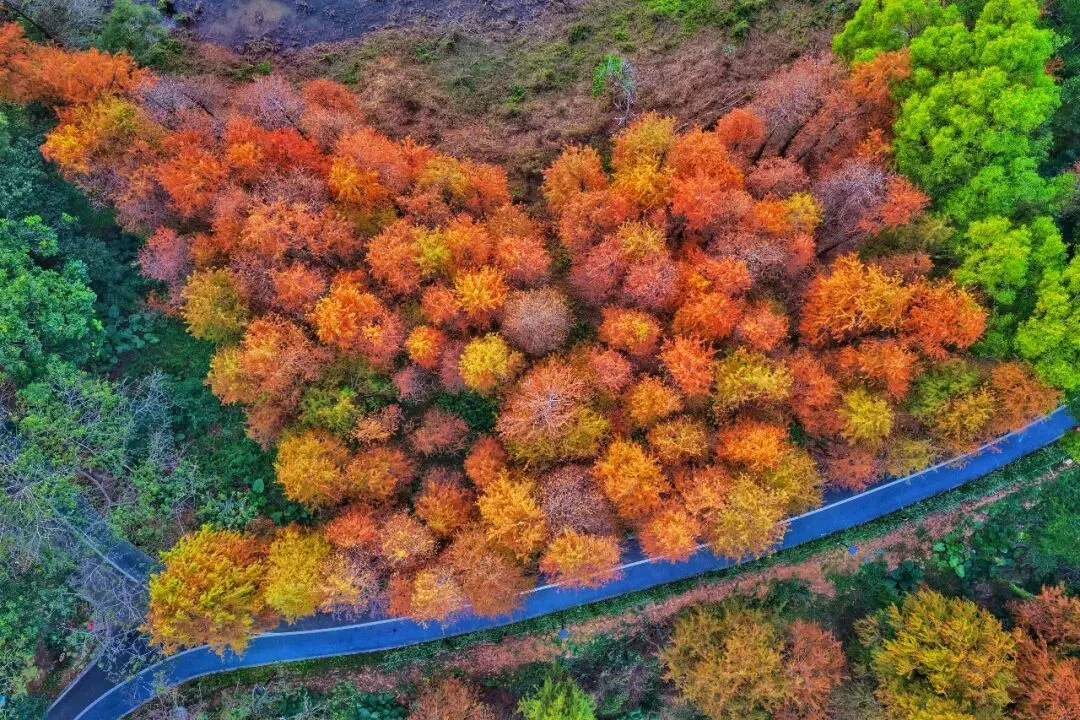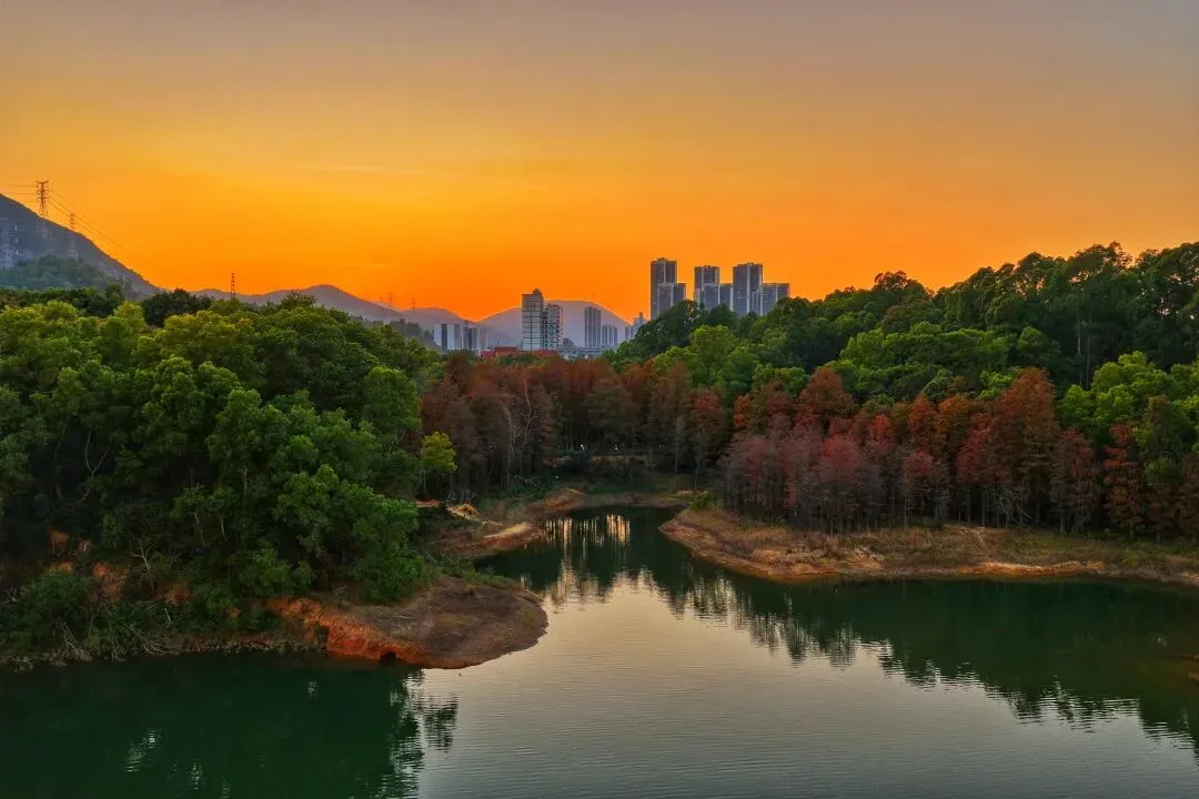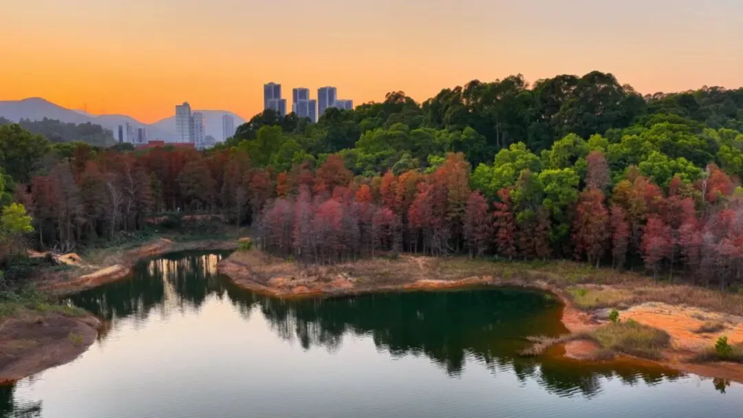 不必远赴他乡追秋寻红,目前大山陂有千株落羽杉正悄悄褪去翠绿,换上蜜糖黄、橘红、赭石交织的盛装,将环湖绿道晕染成莫奈笔下的油画秘境。