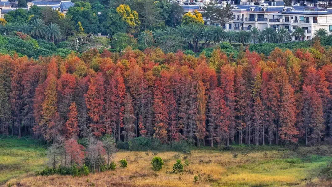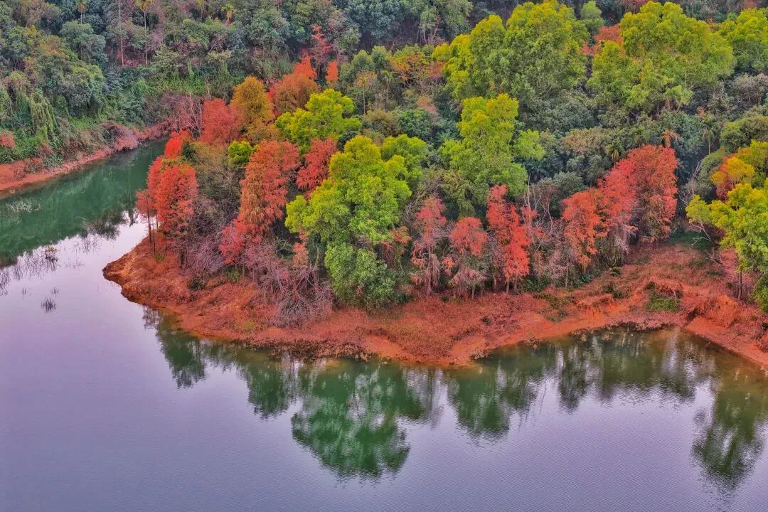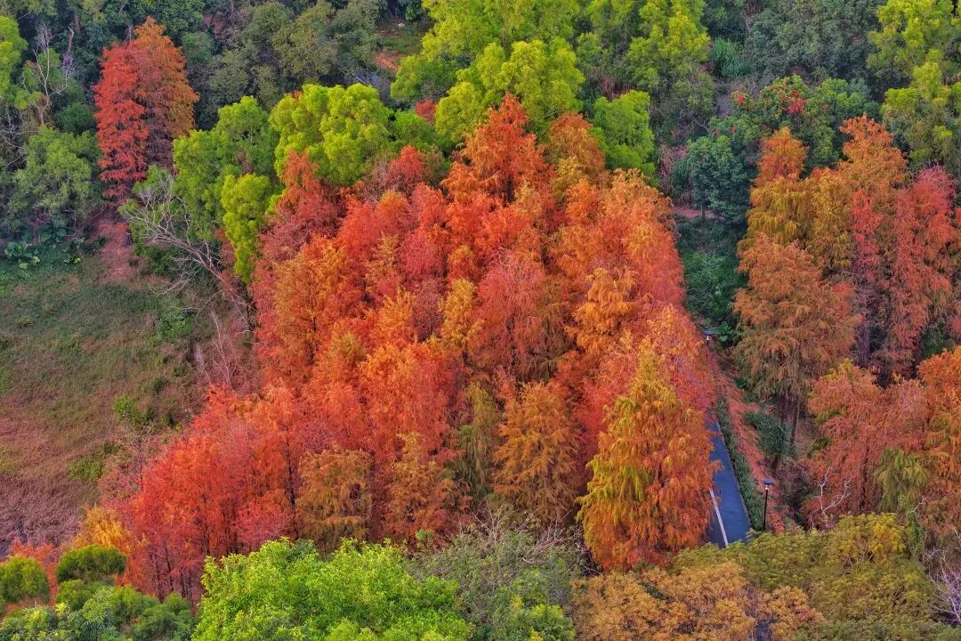 树干笔直修长,羽叶在风中摇动,红、黄、绿三色交织的树冠与水中倒影相连,仿佛一幅对折的油画,随手一拍都是氛围感大片。