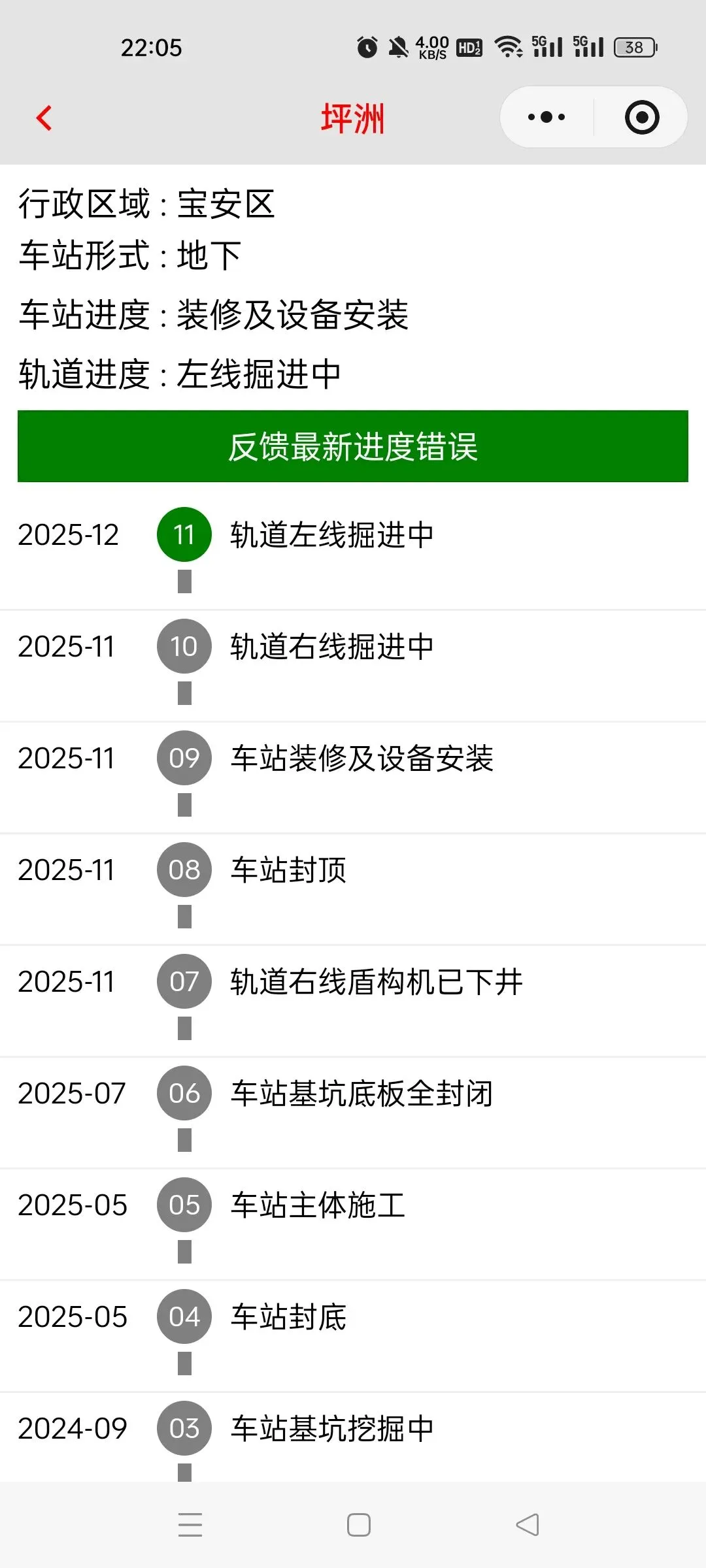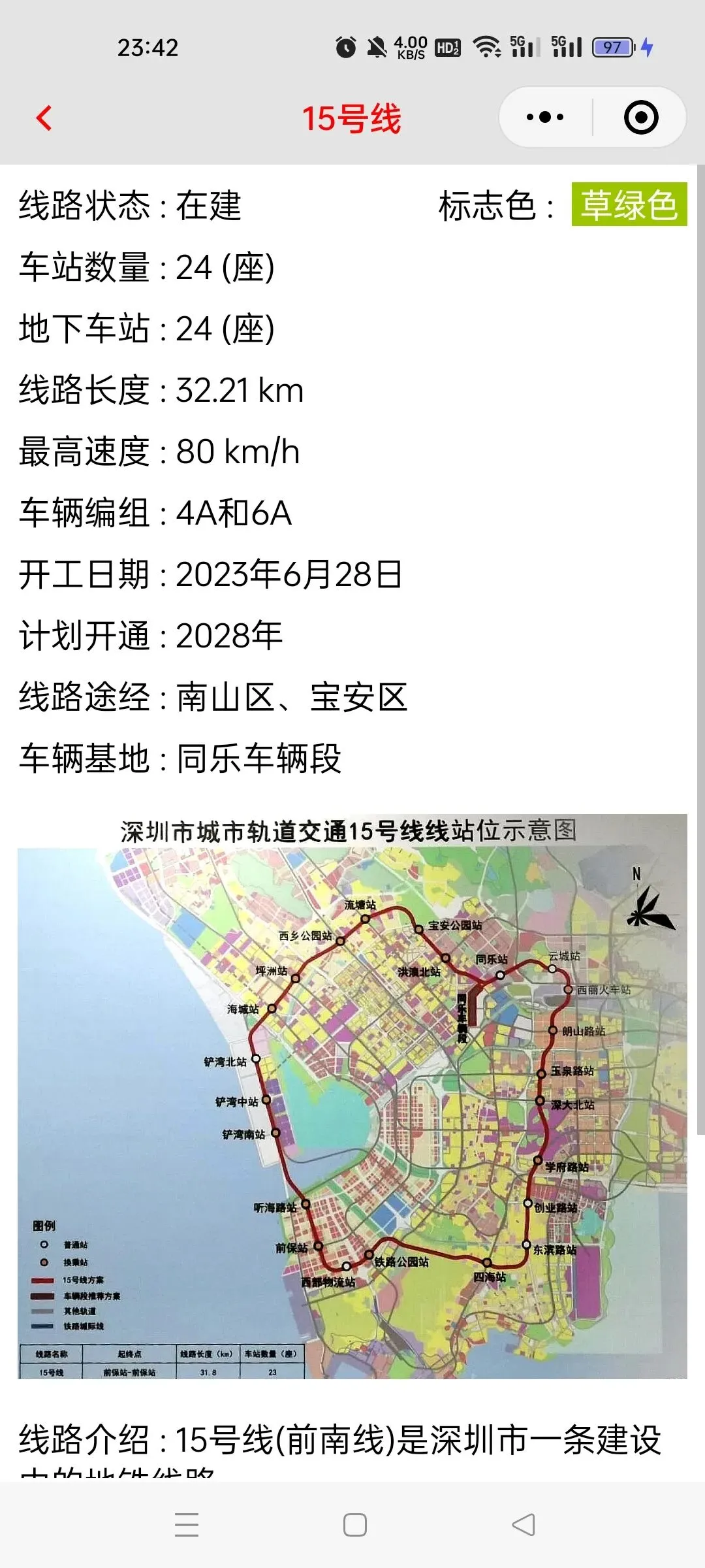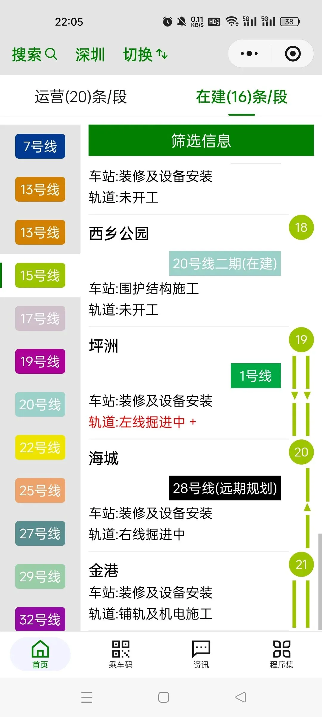 15号线(前海保税区-前海保税区),计划开通时间:2028年。24座地下车站中,11座已封顶,其中11座装修及设备安装,13座土建施工,其中3座围护结构施工,6座基坑挖掘中,4座主体施工;50个轨行区间中,10个已贯通,其中10个铺轨及机电施工,12个土建施工,28个前期准备。同乐车辆段基坑挖掘中。
