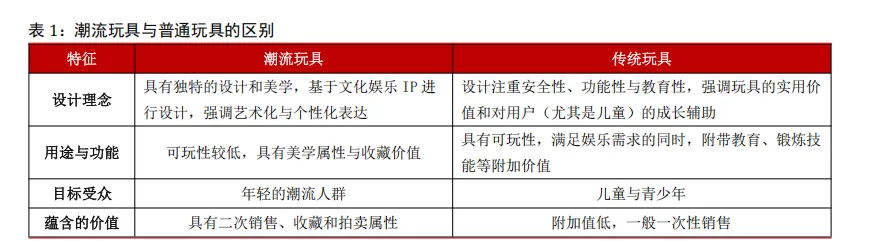 潮流玩具区别于传统玩具,更强调艺术与个性化表达。潮流玩具是将潮流文化与相关内容巧妙融合的一类玩具。它与传统玩具不同,潮流玩具大多凭借独特的设计和出众的美感来吸引消费者,并且多数是基于授权的潮流内容创作而成,强调美学属性和收藏价值,具有二次销售、收藏和拍卖等属性。