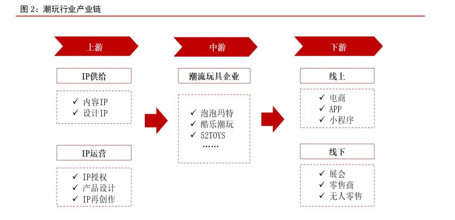 潮玩行业产业链。从潮玩产业链来看,潮玩产业链上游主要系 IP 供给和运营,负责 IP的设计、授权、再创作等;产业链中游以泡泡玛特、52TOYS 等潮玩企业为典型代表;产业链下游主要为销售渠道,消费者可以通过电商等线上平台与零售商等线下渠道购买产品。