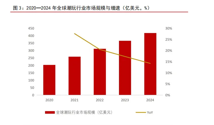 全球潮玩市场规模近几年呈增长态势。潮玩文化凭借其独特的 IP 魅力、个性化表达以及收藏属性,打破了地域与年龄的界限,近几年全球潮玩市场规模增速均维持双位数增长。根据中商产业研究院数据,2020—2024 年全球潮玩行业市场规模从 203 亿美元增加至 418 亿美元,年均复合增速将近 20%。