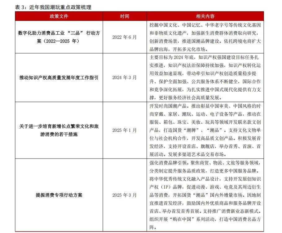 近几年,政府积极出台专项政策,进一步支持我国潮玩行业高质量发展。2025 年 1 月,国务院办公厅印发《关于进一步培育新增长点繁荣文化和旅游消费的若干措施》,提出开发时尚国潮产品,推动在服装、箱包、珠宝、美妆、玩具等领域开发联名款文创产品,打造国货“潮牌”、“潮品”。此外,在今年 3 月中共中央办公厅、国务院发布的《提振消费专项行动方案》中,提到要强化消费品牌引领,将中华优秀传统文化融入产品设计,支持开发原创知识产权(IP)品牌,促进动漫、游戏、电竞及其周边衍生品等消费,开拓国货“潮品”国内外增量市场。国家出台的一系列支持政策为我国潮玩行业发展提供了坚实的政策保障。
