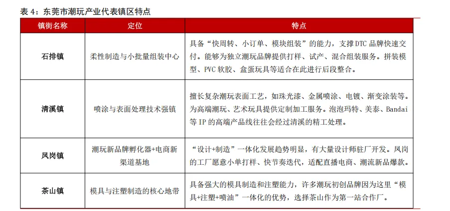 东莞市潮玩产业带以石排、清溪、凤岗、茶山等镇为重点区域,其中石排镇潮玩产值占比最高。从区域分布来看,东莞市潮玩产业带以石排、清溪、凤岗、茶山等镇为重点区域,且各镇均有自身的特色。其中,石排镇是目前东莞市产值最大、潮玩企业及自主品牌最多的镇街,占全市潮玩产值的 30%。2023 年石排镇发力打造“石排潮玩”区域品牌,石排潮玩产业集群成功入选首批“广东省中小企业特色产业集群”;2024 年石排镇玩具产值突破 120 亿元,成功打造“设计—打样—生产—销售”全链条模式,竞争力进一步提升。