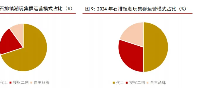 东莞市潮玩产业附加值相对较低。从潮玩产业不同环节来看,IP 版权方主导 IP 的创作与孵化,壁垒较高,且同时承担授权方与运营方角色,毛利率普遍在 30%-40%之间,净利率在 5%-15%之间。因无需承担下游衍生商品的设计制造成本,IP 代理商的毛利率较高,但与此同时考虑到 IP 采购成本与市场推广费用,净利率相对较低。IP 运营方负责在授权 IP 基础上,设计研发对应的衍生产品,整合代工厂进行生产。该环节由于产品间差异较大,毛利率与净利率的范围相对较广。玩具代工厂技术壁垒低,对厂商的议价能力相对较弱,价值量最低,毛利率在 10%-20%左右,净利率在 5%-10%甚至更低。近几年随着东莞市潮玩产业规模稳步发展,叠加企业积极转型,产业结构逐步优化,代工比例逐步减少。但从石排镇 2024 年的数据来看,代工仍为东莞潮玩主要的经营模式,对应的东莞潮玩产业附加值相对较低。