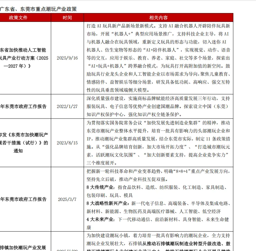 政策支持东莞潮玩产业发展。为进一步推动潮玩产业高质量发展,除国家层面的政策支持外,广东省、东莞市等多方主体亦积极出台相关政策。2025 年 9 月 16 日,《广东省加快推动人工智能赋能玩具产业行动方案(2025—2027 年)》出台,提出打造 AI 玩具新产品新场景新模式。支持 AI 融合机器人开辟陪伴玩具新市场,开展“机器人+”典型应用场景推广,支持科技企业主导,将 AI 与机器人融合在玩具领域,重新定义玩具的形态与功能。除广东省外,东莞市积极制定政策推动潮玩产业发展。2022 年,“支持服装玩具、电子信息等优势产业创建国潮品牌”首次写入东莞政府工作报告;2023 年 8 月印发《东莞市加快潮玩产业发展若干措施(试行)》的通知,从三大维度 11 条政策措施入手推动东莞潮玩产业发展。当前,东莞市产业体系“8+8+4”中,玩具作为 8 大传统产业中的重要一环,是未来重点产业发展方向。今年 8 月,《东莞市加快潮玩和动漫产业发展若干措施》出台,计划拿出 1.2 亿元产业扶持资金,从产业生态、开拓市场、内容创作、动漫产业、要素保障等五大方面支持潮玩和动漫产业高质量发展。石排镇作为东莞潮玩的关键区域,6 月出台了《石排镇加快潮玩产业发展若干措施(试行)》。此外,相关负责人介绍该镇每年将拿出 1000 万元专项资金制定产业扶持政策,专门划出 10 万平方米低成本空间,力争打造全国规模最大、生态最完备的潮玩产业园。一系列的潮玩政策,为东莞市潮玩产业高质量发展奠定了坚实基础。