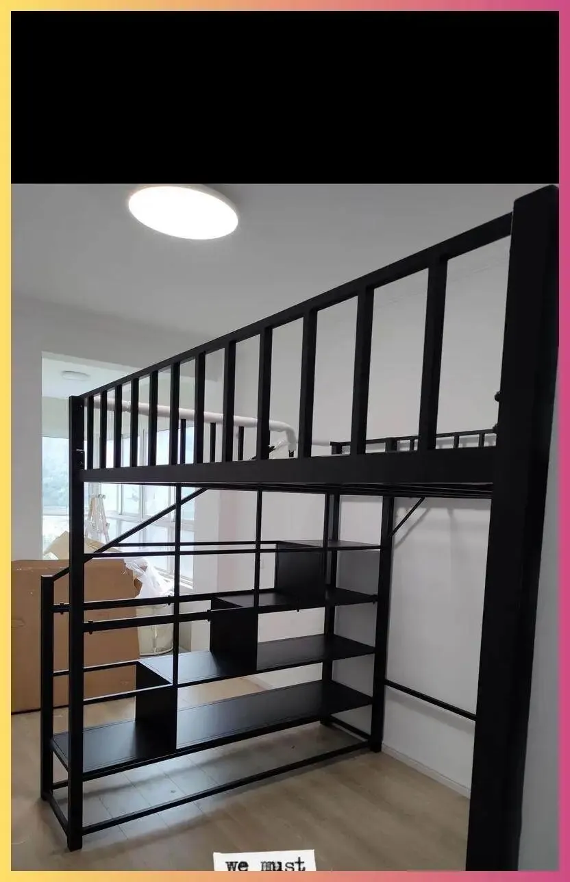 他还用床侧空间做收纳区,放宿舍铁架层;顶部转角挂钩放袋子,不浪费一寸地。