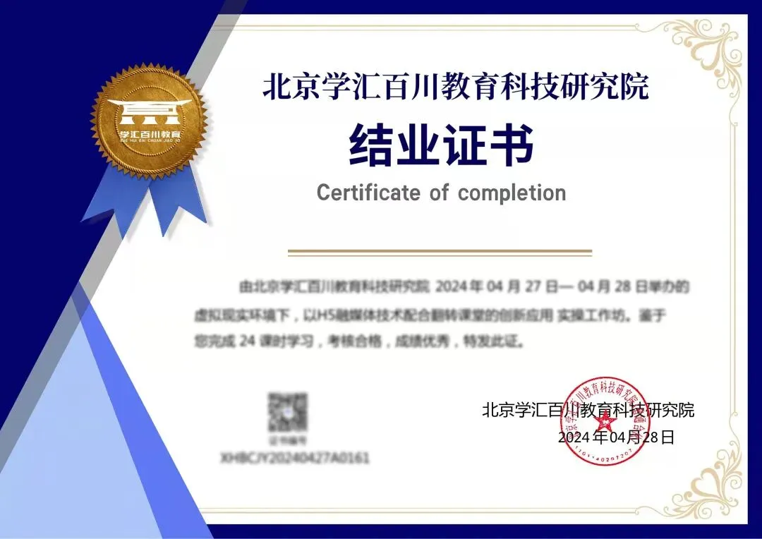 学员完成全部课程,将获北京学汇百川教育科技研究院具章的培训证书,可作为教师继续教育每年学时要求的证明。