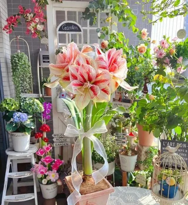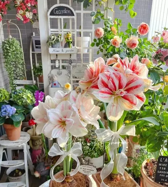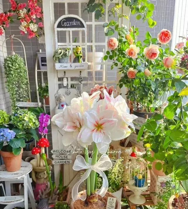 但这姑娘把它变成了一个小花园 , 十几盆朱顶红轮着开 , 一年到头都有花看。