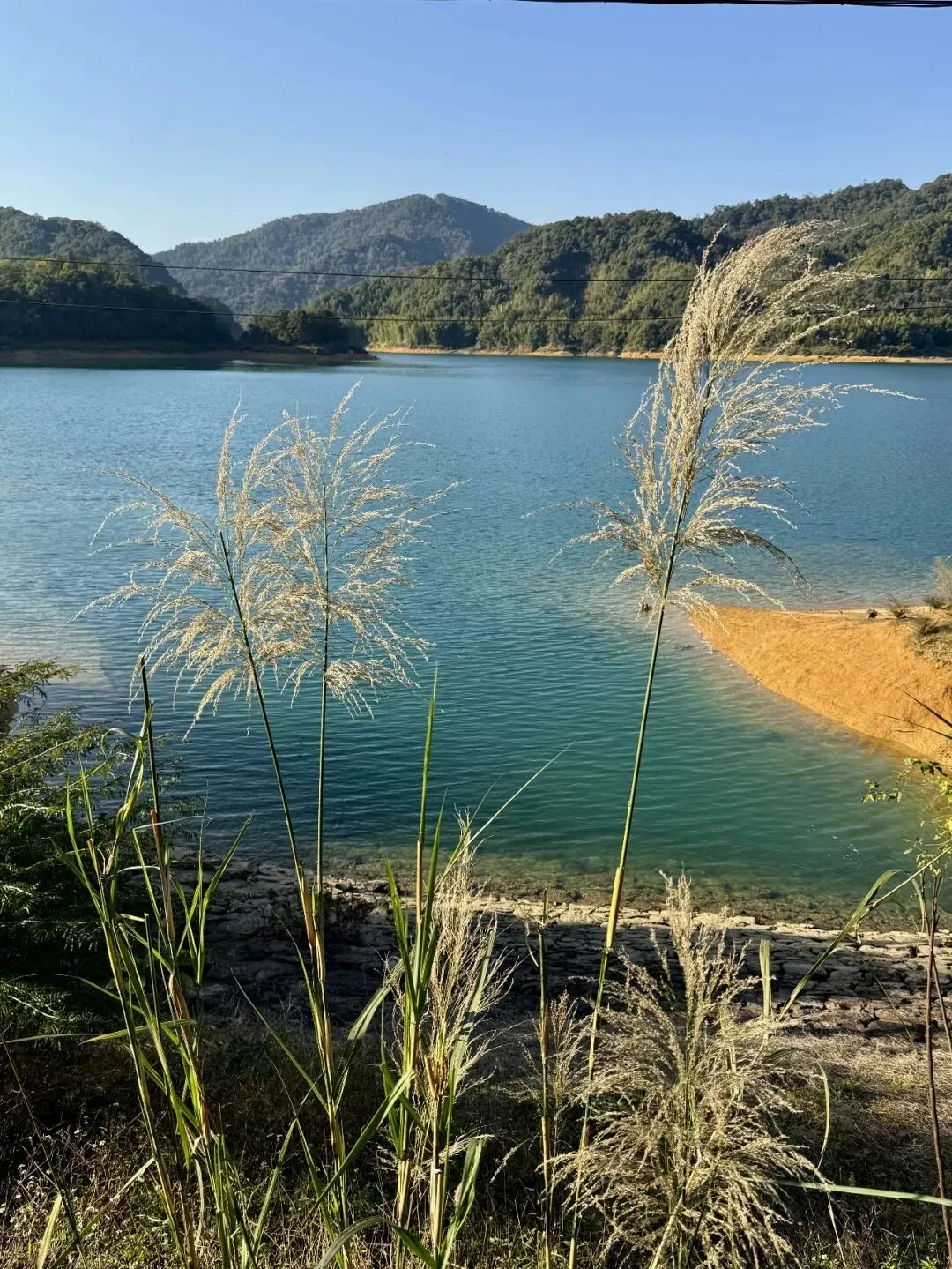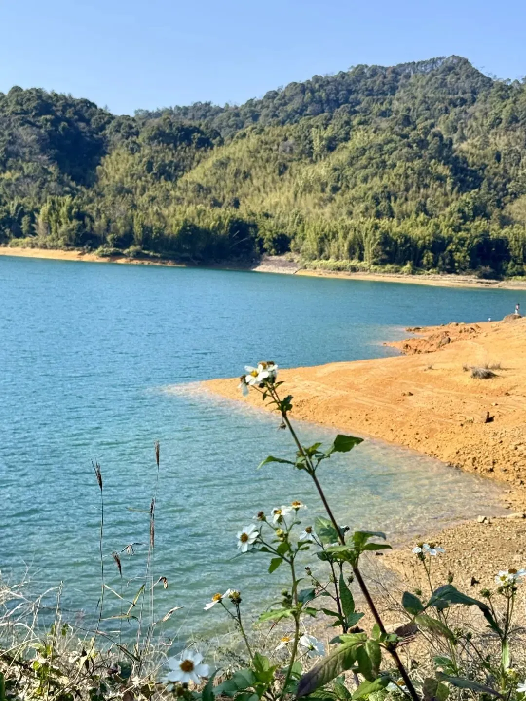 满眼的碧绿完全无需滤镜来凑:澄澈的蓝天裹着暖融融的阳光,碧绿清澈的水库像块翡翠嵌在山林间。水面澄澈得能看见水底的光影,岸边的小白花、芦苇在风里轻轻摇曳,深吸一口气,全是负离子的清新。