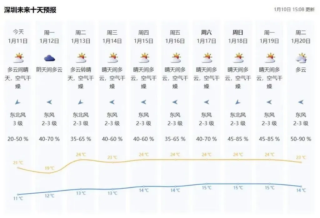 深圳气象局表示,近期虽有冷空气影响,但是5天的平均气温还是13.5℃,尚未达到入冬标准,且深圳并非每年都会入冬,入冬概率在50%左右;国家标准滑动5天的平均气温低于10℃即入冬,10℃那天即为入冬日。