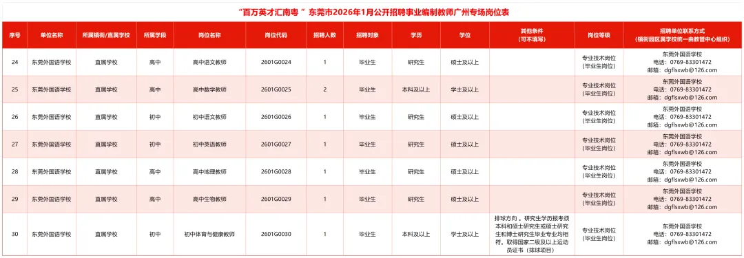 1.“百万英才汇南粤”东莞市2026年1月公开招聘事业编制教师广州专场岗位表