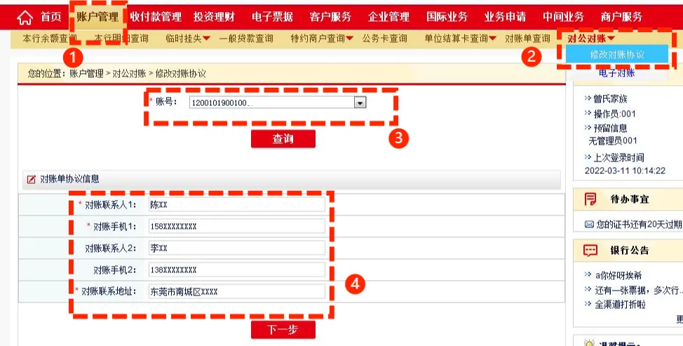 已开通我行企业网银专业版的客户可通过网银修改对账协议信息。