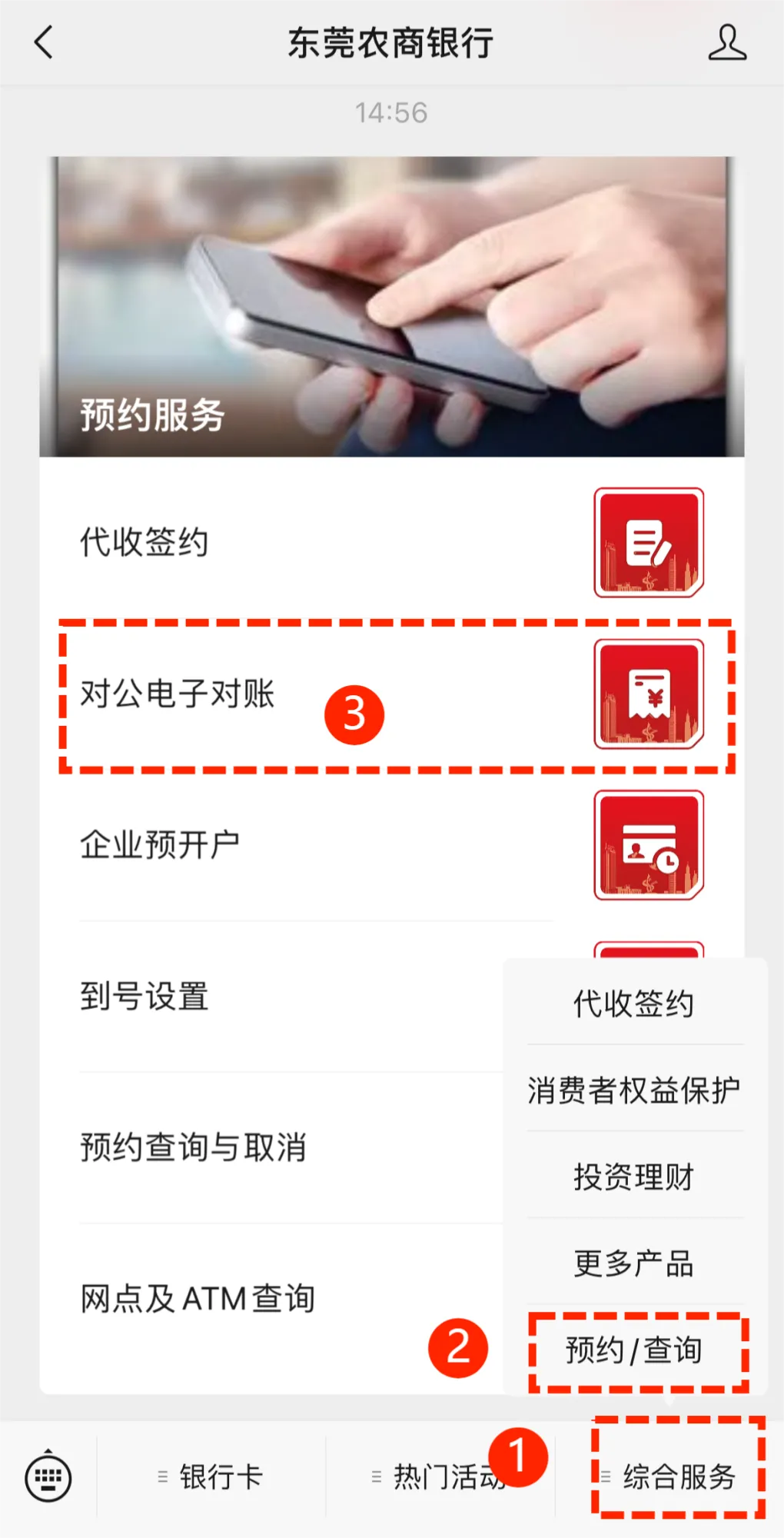 微信公众号关注“东莞农商银行”,进入后点击“综合服务”—“预约/查询”—“对公电子对账”