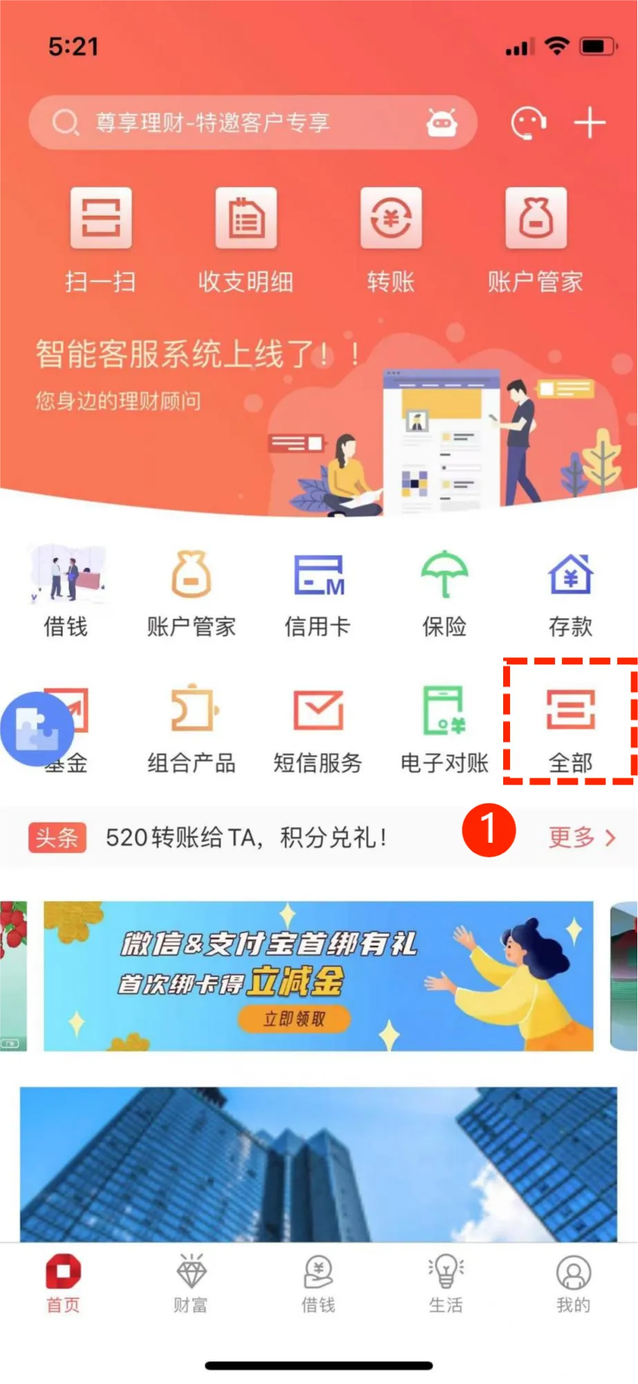 打开我行手机银行App,点击“全部”