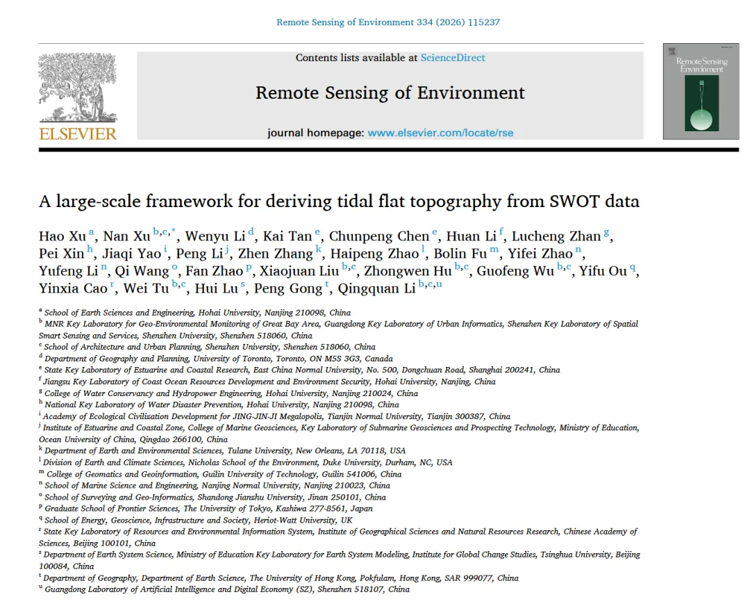 使用 2024 年获取的 SWOT Level-2 高分辨率栅格产品(SWOT_L2_HR_Raster_2.0),仅保留水面高程质量标志 wse_qual ≤ 1 的像元,并统一采用 EGM2008 高程基准。为排除非潮滩及异常高程影响,设置 −2 m 至 +5 m 的高程约束窗口。对于每个 100 m 潮滩像元,首先计算其 SWOT 水位时间序列的第 10 分位数作为初始高程估计(H₀),以降低极端异常值影响。随后,结合全球海岸特征数据库(GCC)提供的 MLLW 与 MHHW 信息,将各海岸网格内像元按 H₀ 分层,并依据各层内水位低于潮位下界的经验概率,自适应确定最优分位数(best-q),从而反演最终潮滩高程。由于 SWOT 在间歇性出露潮滩上的观测不连续性,反演结果中存在空间空缺。为此,缺失像元需在 Moore 八邻域内至少具有 4 个有效像元方可参与插值。该过程以迭代方式执行,并对线性插值、最近邻、IDW 与普通克里金方法进行对比。基于独立验证结果,最终选用线性插值生成全国尺度潮滩地形产品。