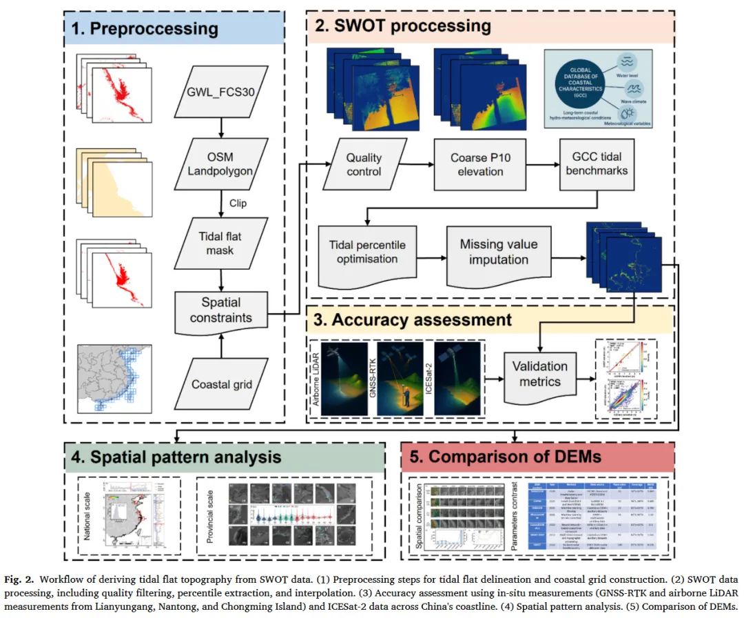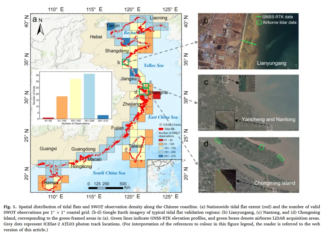 为确保后续 SWOT 潮滩地形反演的可靠性与空间一致性,首先基于 GWL_FCS30 湿地分类产品提取潮滩类别(class code = 187),构建二值潮滩掩膜。随后,利用 OpenStreetMap(OSM)陆地边界剔除内陆湿地与非海岸区域,确保仅保留沿海潮滩范围。最后,基于 OSM 海岸线将中国沿海划分为 90 个连续的 1° × 1° 海岸网格单元,作为统一的数据处理与分析基本单元。该模块化设计提高了计算效率,并增强了方法在不同区域间的可迁移性。