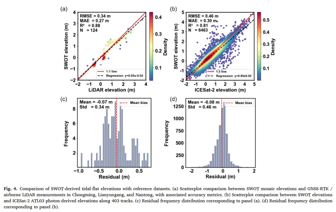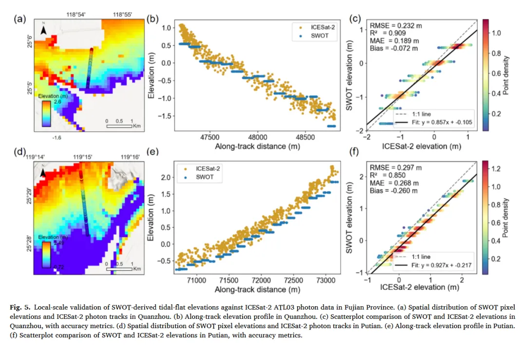 反演结果分别通过地面实测与星载测高两类独立数据进行验证,包括 GNSS-RTK、机载 LiDAR(崇明岛、南通与连云港)以及 ICESat-2 ATL03 光子数据。所有数据统一转换至 WGS84 平面坐标与 EGM2008 高程基准。通过空间匹配提取与 SWOT 像元对应的参考高程,并采用稳健的下包络统计方法代表暴露潮滩表面。精度评估采用 RMSE、MAE、平均偏差和决定系数(R²)等指标,分别在局地高精度样区和全国尺度上进行。
