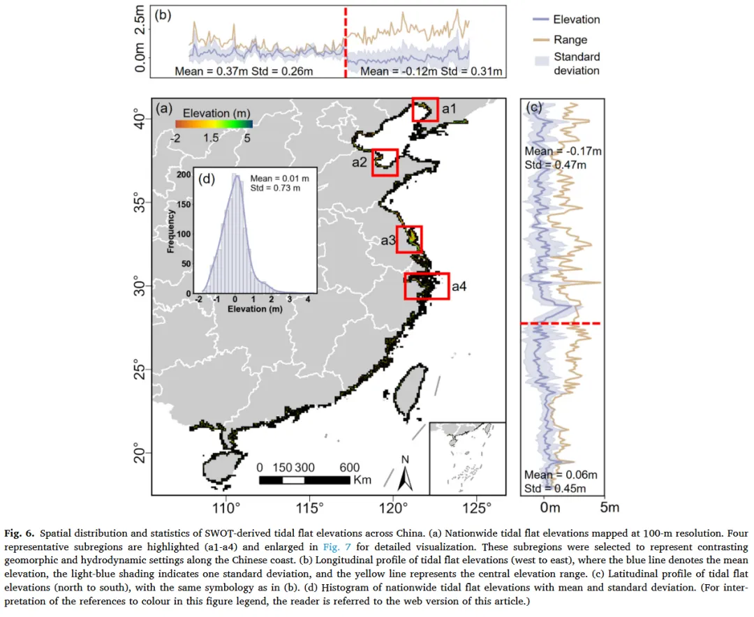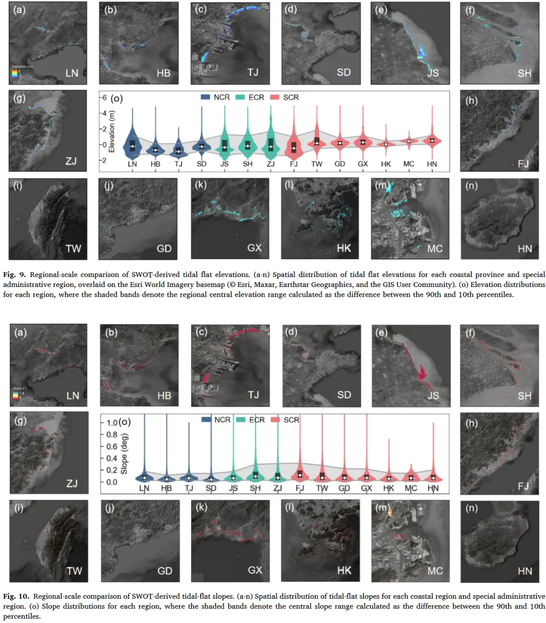 将 90 个海岸网格合并生成全国尺度潮滩地形数据集。为便于宏观展示与统计分析,将结果聚合至 0.1° 网格计算平均高程,仅用于可视化。进一步基于行政区划对 14 个沿海省区的潮滩高程分布特征进行对比分析。同时,基于 SWOT 潮滩地形计算坡度信息,以辅助解释区域地貌差异。