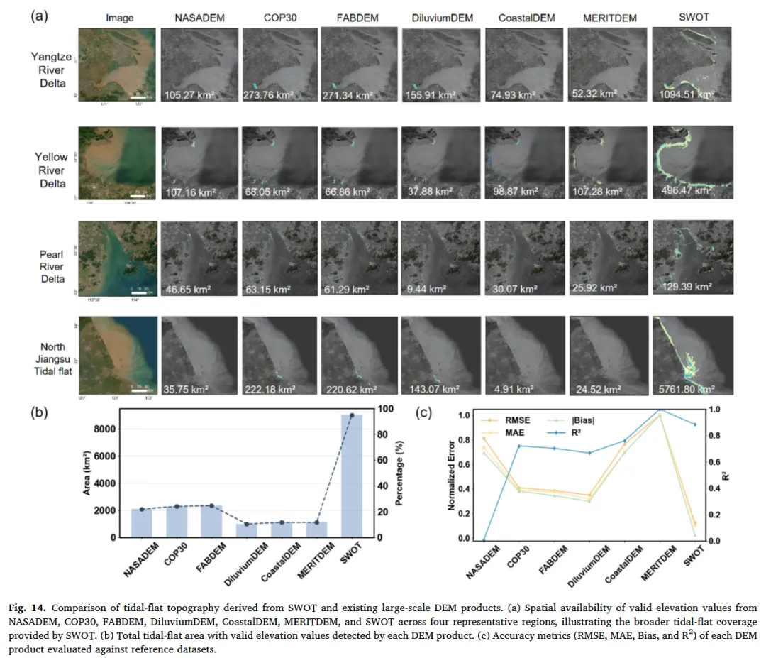 为评估 SWOT 潮滩地形的相对优势,将其与 NASADEM、COP30、FABDEM、MERITDEM、DiluviumDEM 和 CoastalDEM 进行对比。所有 DEM 统一重采样至 100 m 并转换至 EGM2008 基准。通过潮滩掩膜统计各 DEM 的有效覆盖比例,并结合地面实测与 ICESat-2 数据,对不同 DEM 在潮滩区域的垂向精度进行一致性评估。