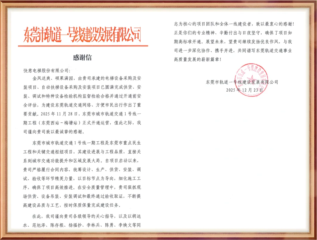 信中高度肯定了快意电梯在“东莞轨道交通1号线自动扶梯及电梯设备采购与安装项目”中的专业能力与敬业精神,并对圆满交付表示感谢。