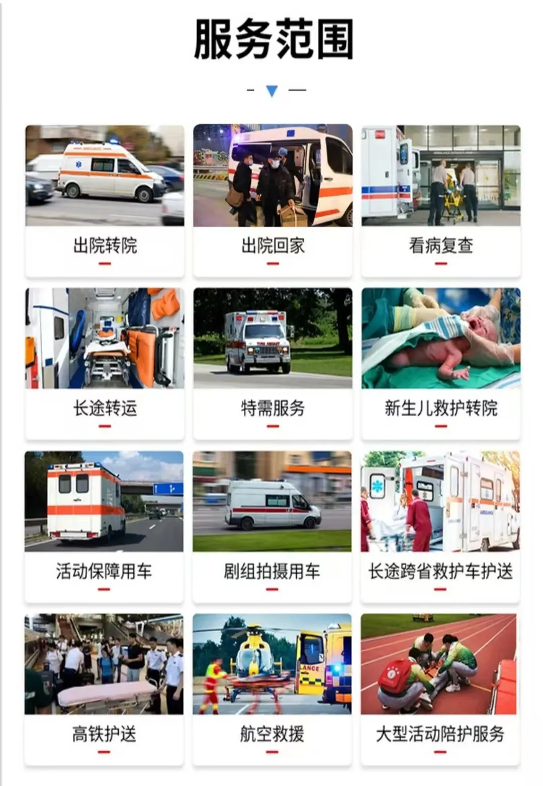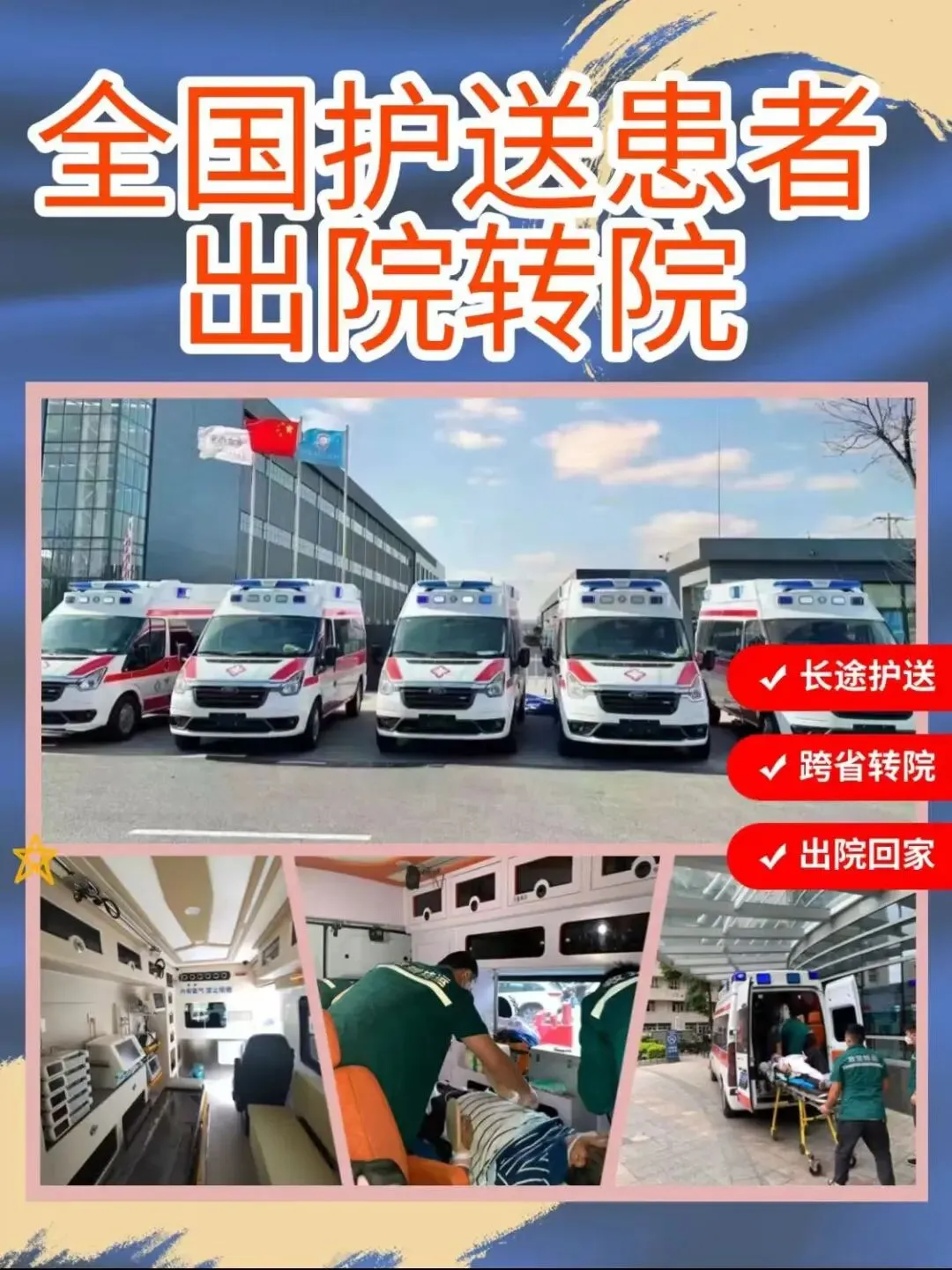 我们是120救护车出租转运预约平台,我们家是正儿八经的非急救护送专业业务。我们家的业务特别的全乎接送病人出院转院、新生儿恒温转运、遗体转院护送、跨省转院护送等等,我们都可以做。