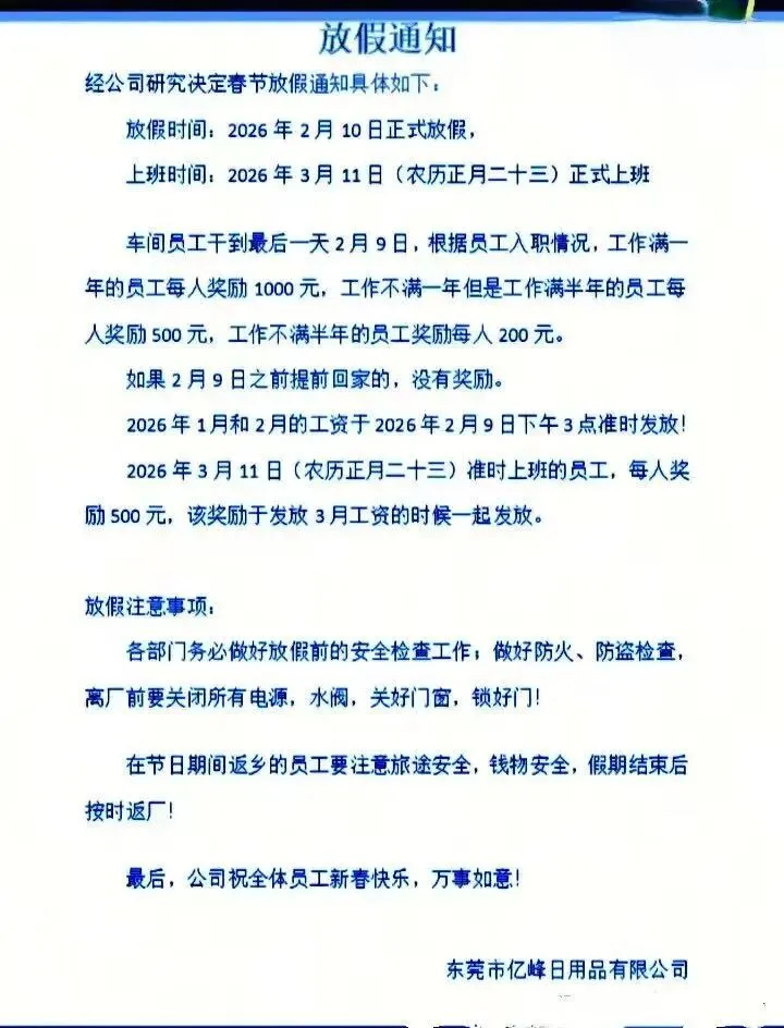 此外,公司还推出多项奖励政策:坚守到放假最后一天的车间员工,按工龄可获200 - 1000元不等奖励;3月11日准时返岗的员工,人人能领500元。更让人惊喜的是,2月9日下午3点会一次性发清1月和2月的工资。