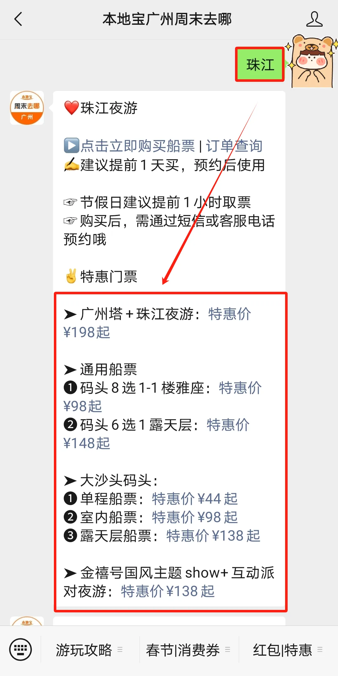 在对话框内发送【珠江】即可获取