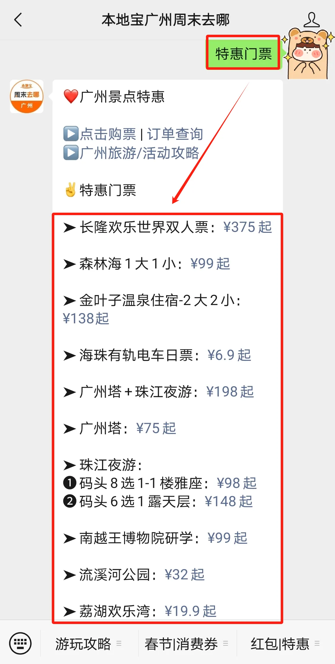 在对话框内发送【特惠门票】即可获取
