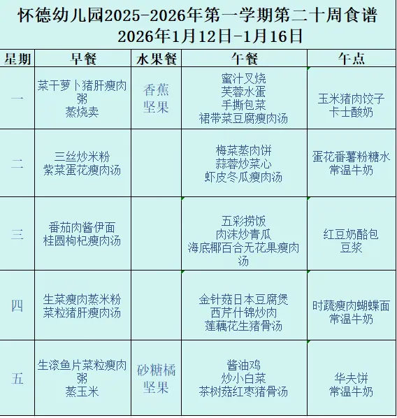 东莞市虎门镇怀德幼儿园第二十周(1月12-16日)食谱