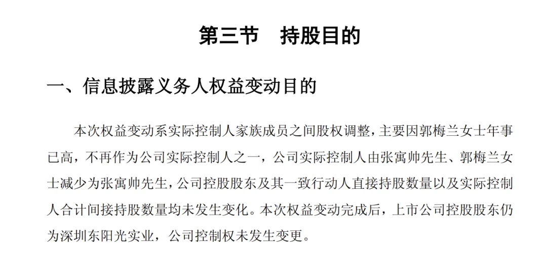 财富交接这个事的起因是,东阳光在2025年12月30日发布的一份权益变动公告,因郭梅兰年事已高,不再作为公司实控人之一,实控人由张寓帅、郭梅兰两人,变更为张寓帅一人。