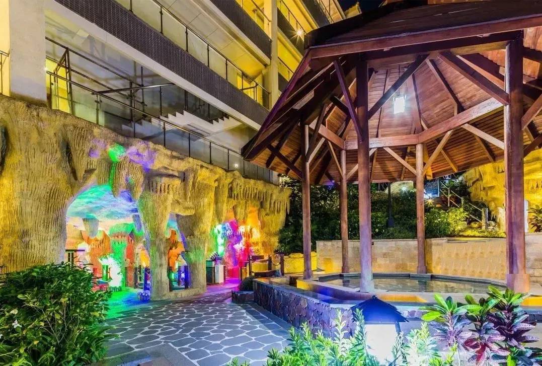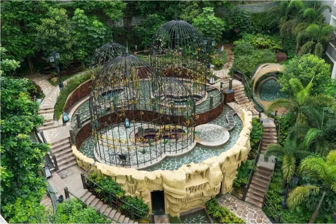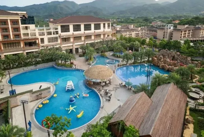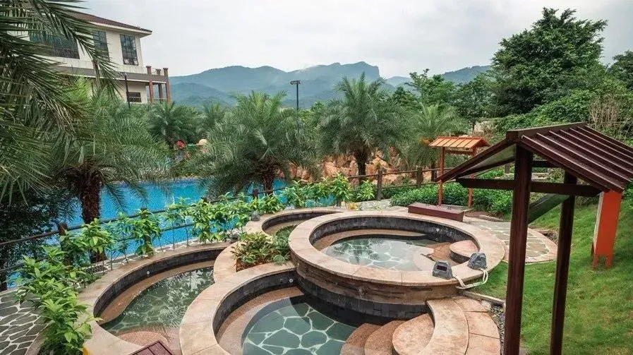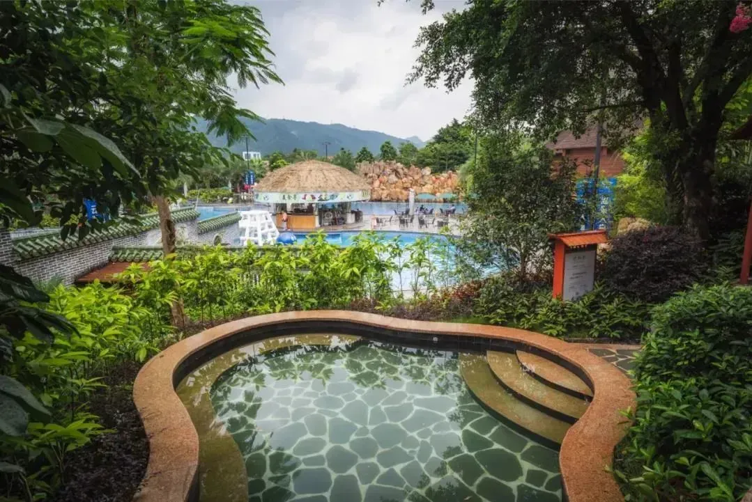 酒店温泉、泳池区介绍:酒店拥有70多个露天温泉池,分为十大区,包括动感娱乐区、日月乾坤区、五常六德区等。温泉水富含硅酸、氟、偏硅酸、氡等多种有益微量元素,属弱碱性温泉水,是2017年广东省首批真温泉。以下是一些特色泡池介绍 :溶洞温泉区:采用钟乳石和石笋打造出形态各异的景观,冬暖夏凉,洞内有鱼疗池、多种不同功效的中药池等。动感水疗区:特设动感理疗池、儿童池、冲浪池、休闲泳池及标准泳池等。海浪池有升级版七彩泡泡浴,休闲泳池有网红摇摆桥。树洞温泉区:位于溶洞温泉区旁边,一树一世界,一洞一天堂,另设温泉雾疗,对呼吸系统疾病有较好疗效,开放时间早上9点--晚上11点,可无限次进出