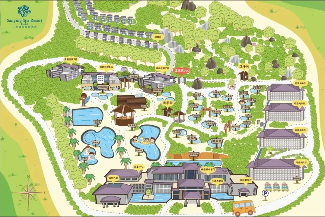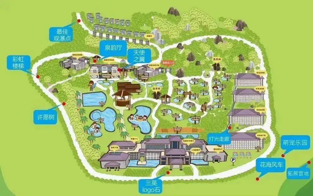 溶洞温泉区、树洞温泉区、浪漫温泉区