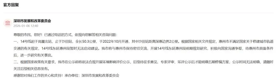深圳市发改委在回复市民咨询时明确指出,根据国家相关文件规定,惠州市目前暂不满足修建城市轨道交通的条件,因此14号线东延惠州段暂时无法启动建设。