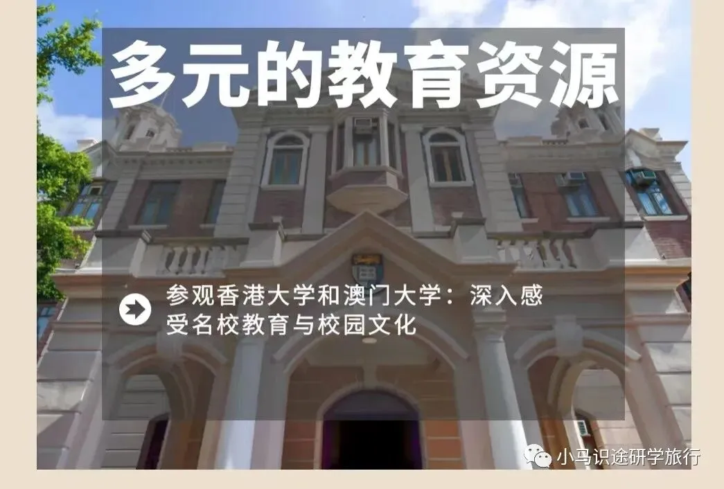 香港大学作为香港最古老、最顶尖的大学之一,有广泛强大的学科覆盖范围,享有极高的学术声誉及地位。在全球大学中排名一直名列前茅,2023年的QS世界大学排名位列全球21名。我们将带领孩子参观香港大学,零距离感受香港大学的教育与校园文化,这里汇聚了世界各地的不同文化背景的学生,丰富的体验机会开阔眼界,培养全球视野,筑梦未来的升学之路!和大学生学哥学姐交流,真正的开阔视野,看到多种不同的学习途径和求学生涯,我们的路很宽广,而脚下的路取决于我们的眼界和视野