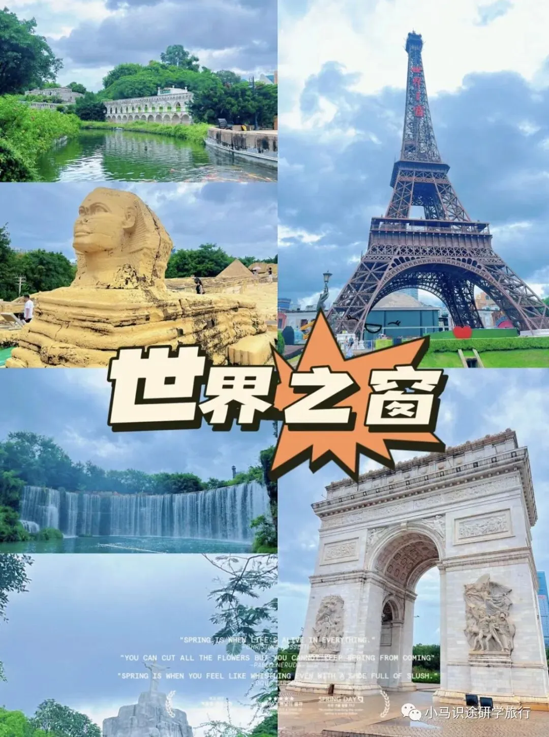 世界之窗内精确地缩小了世界上许多著名建筑和景点,如法国的埃菲尔铁塔、意大利的斜塔、印度泰姬陵等。游客可以在一天之内“走遍全球”,领略到各种国家的风土人情、文化特色和建筑风格。虽然世界之窗是浓缩的世界,但是我们的心可以很大,我们可以把一个中国人的角色放在全世界,我们都是地球的孩子,要有全球观念和让全世界更好的使命感!