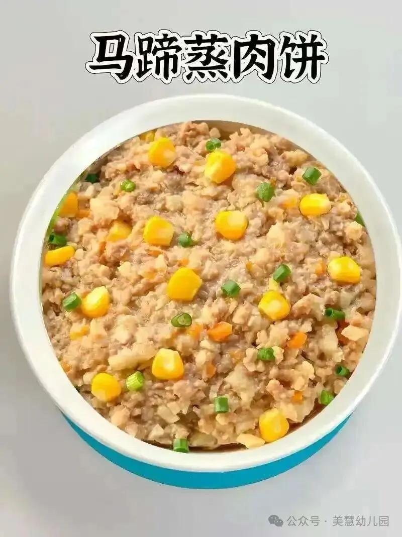 红萝卜玉米马蹄蒸肉饼、肉丸炒花菜、枸杞叶瘦肉汤、双色米饭