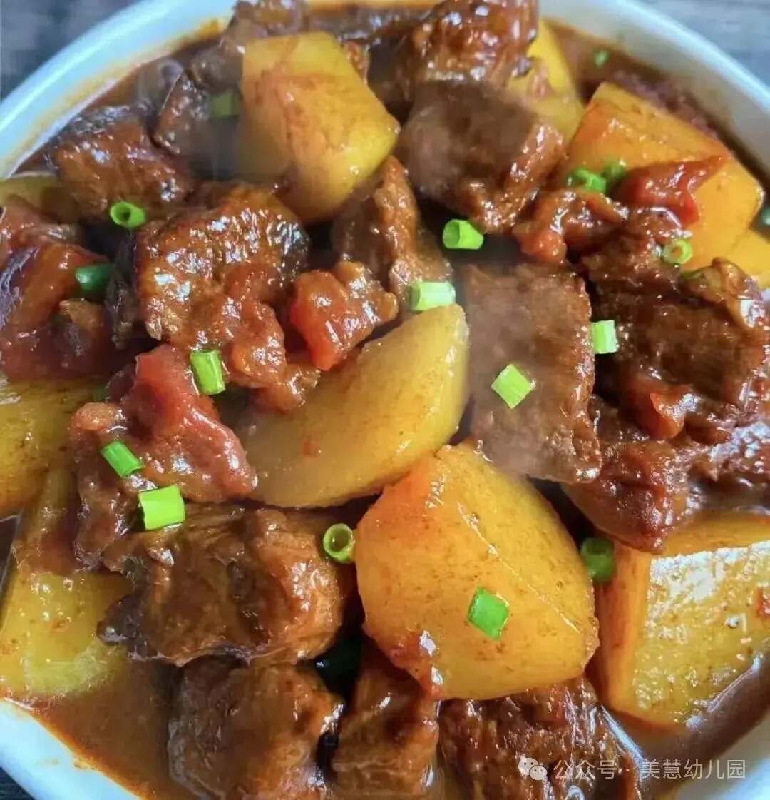 西红柿土豆焖红烧肉、肉丝炒芥兰头菜、霸王花骨头汤、双色米饭