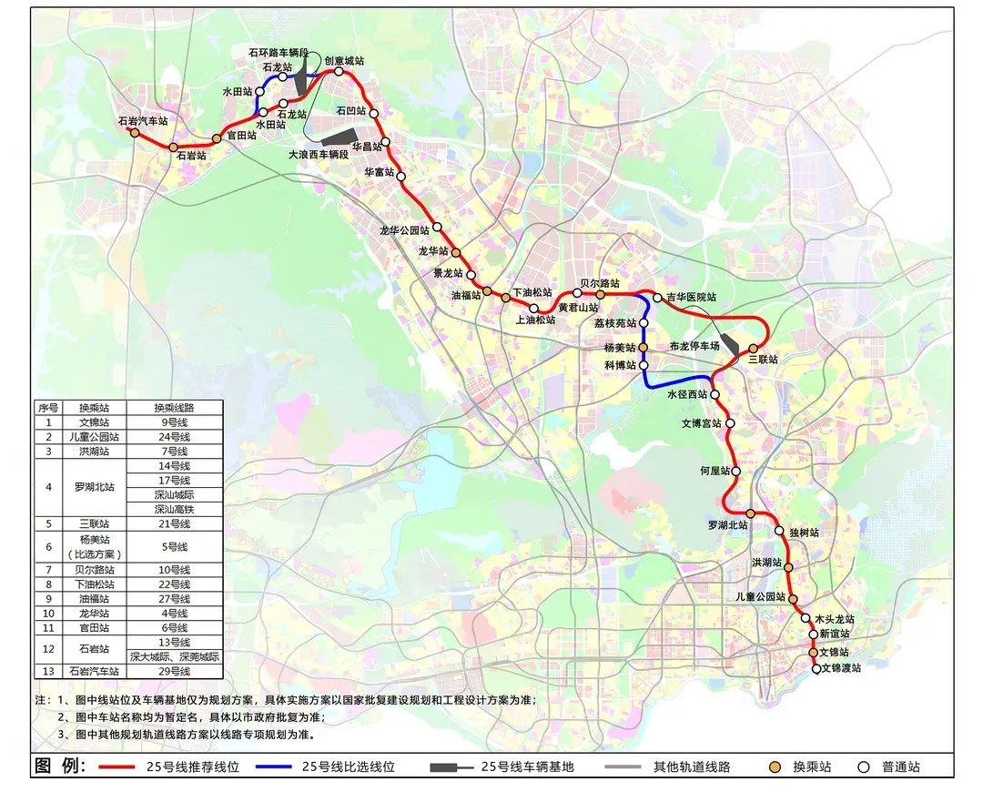 其中在建的为深圳地铁25 号线一期为服务龙岗、龙华、宝安的轨道普线,覆盖沿线吉华、坂田、龙华中心等人口岗位密集区旺盛出行需求,支持坂雪岗科技城重点片区发展。深圳地铁25 号一期线起自石龙站,终至吉华医院站,全线长约 16.2 公里,设站 14座(石龙站、创意城站、石凹站、华昌站、华富站、龙华公园站、龙华站、景龙站、油福站、油松站、上油松站、黄君山站、贝尔路站、吉华医院站),全部为地下敷设。