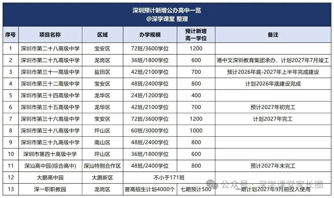 预计未来深圳新增公办高中和综合高中共计13所,家长可提前了解。