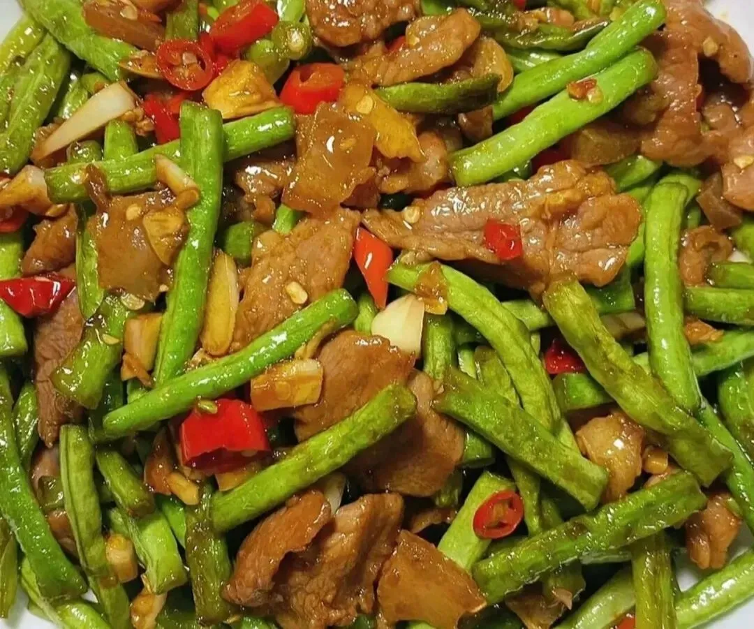 肉片炒豆角、牛肉丸、鸡蛋、时蔬、猪骨玉米汤