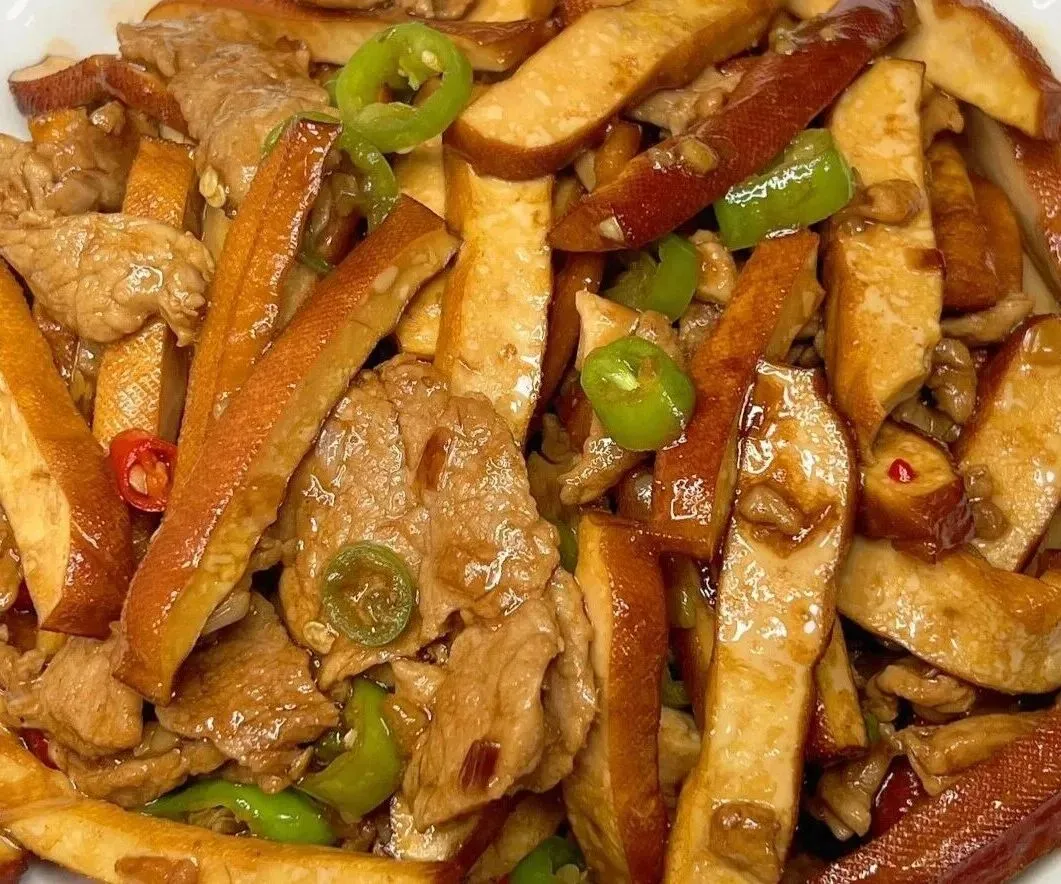 猪肉炒卤水豆腐片、排骨焖香菇、肉片炒榨菜、时蔬、猪骨金针菇汤