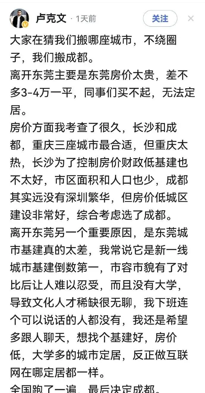 和众多网友一样,我带着强烈的本土情结反驳:“发迹于东莞,如今不过是找个养老地罢了”“华为都扎根于此,谈何基础设施差”“房价贵是普遍现象,凭什么单说东莞”“走就走了,还要踩一脚东莞,未免太过刻薄”。